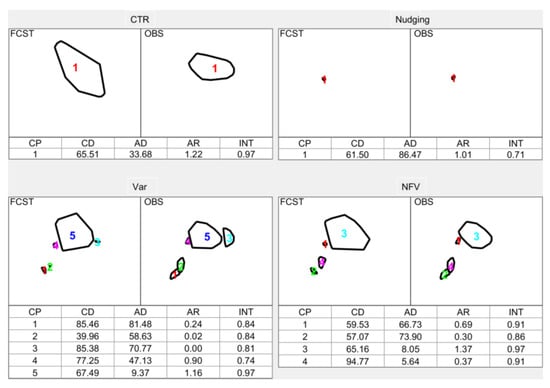 As shown in Figure 12, the MODE total interest (TI) for SHR is valid only at 10 UTC for Nudging (0.74). CTR, Var, and NFV achieve TI above 0.8 during 07:00~11:00 UTC, indicating good spatial features, but Var’s TI drops sharply to 0.11 at 12 UTC, revealing pronounced spatial error.