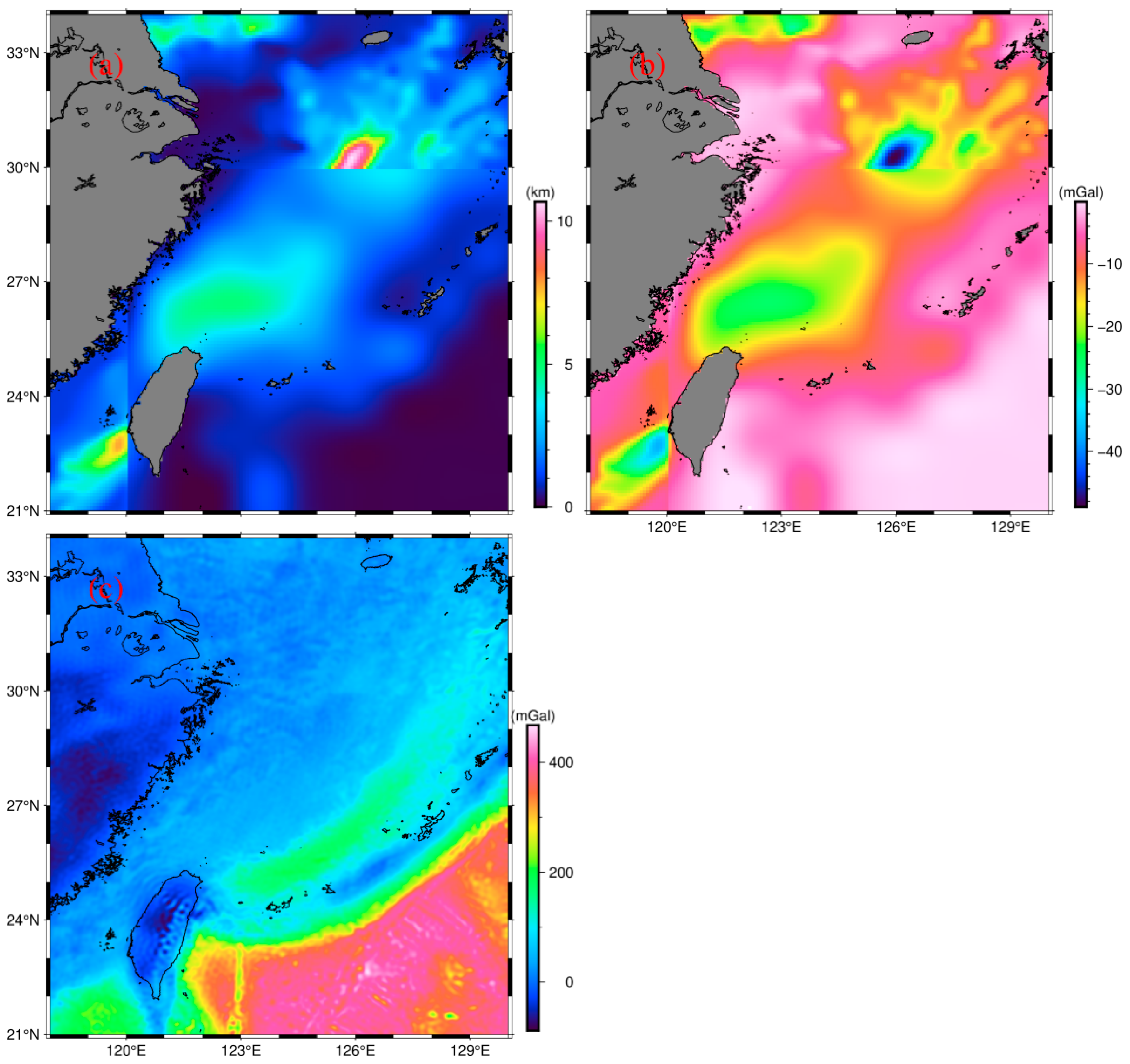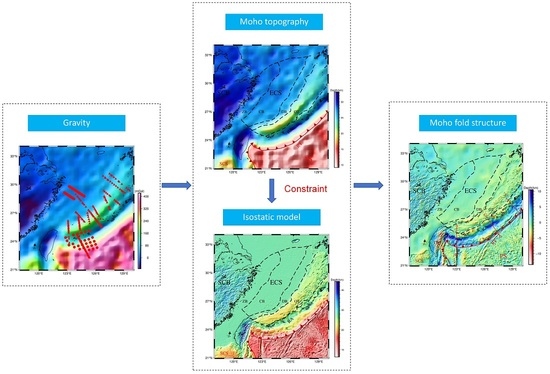 - Xuan, S.; Jin, S.; Chen, Y. Determination of the Isostatic and Gravity Moho in the East China Sea and Its Implications. J. Asian Earth Sci. 2020, 187, 104098. [Google Scholar] [CrossRef]