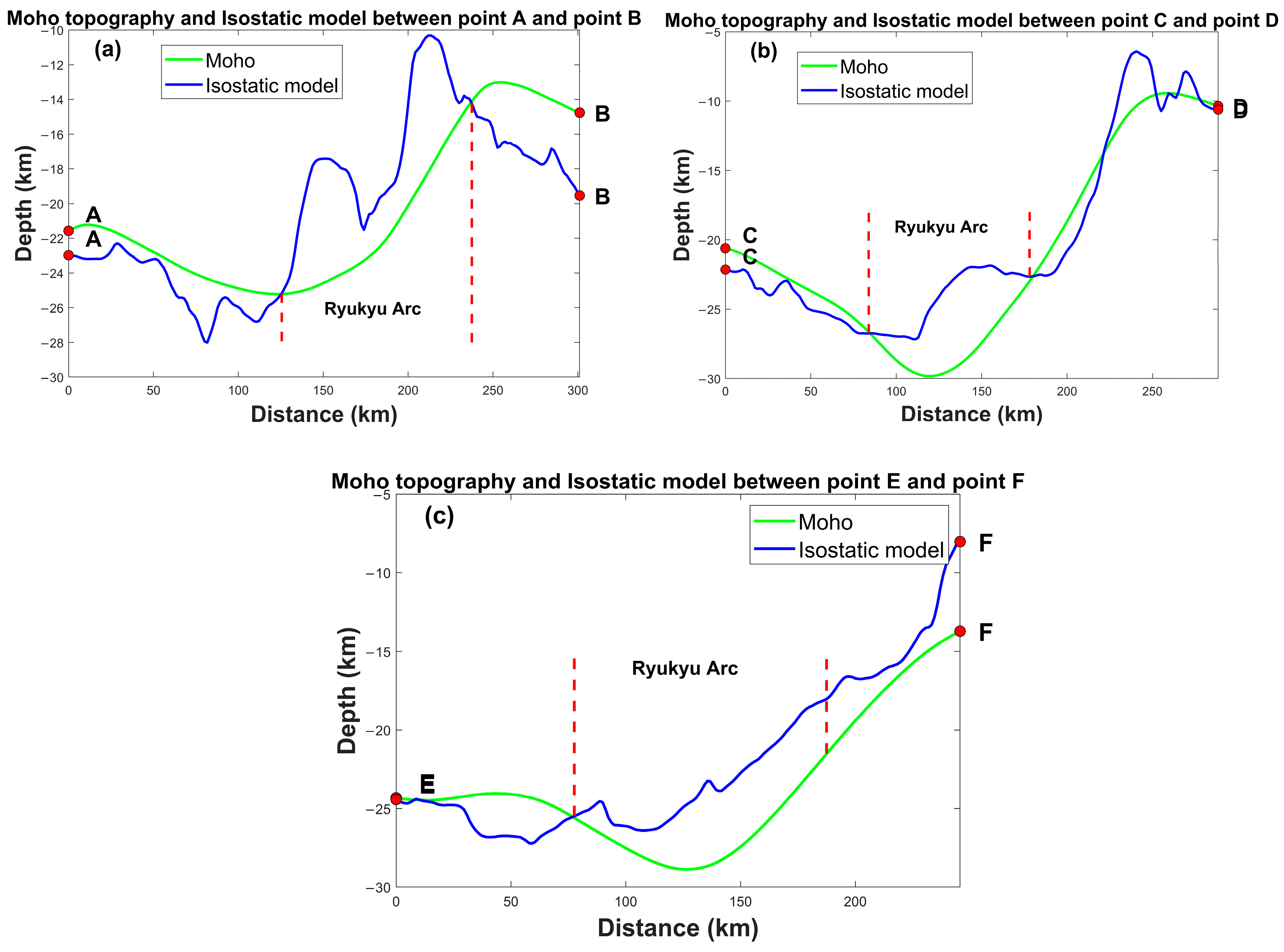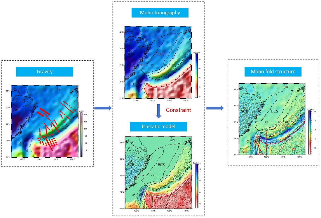 - In different regions of the Ryukyu Arc, the internal structures are subjected to different subduction vertical forces. The most exceptional of these is the southwestern part of the Ryukyu Arc (near Taiwan Island). Here, the Moho fold structure is the thickest, approaching 10 km. However, compared to other areas of the Ryukyu Arc, the crust here is the thinnest, with a Moho depth of about 25 km. In other words, the subduction vertical force is not dominant here, and therefore does not cause significant crustal thickening.