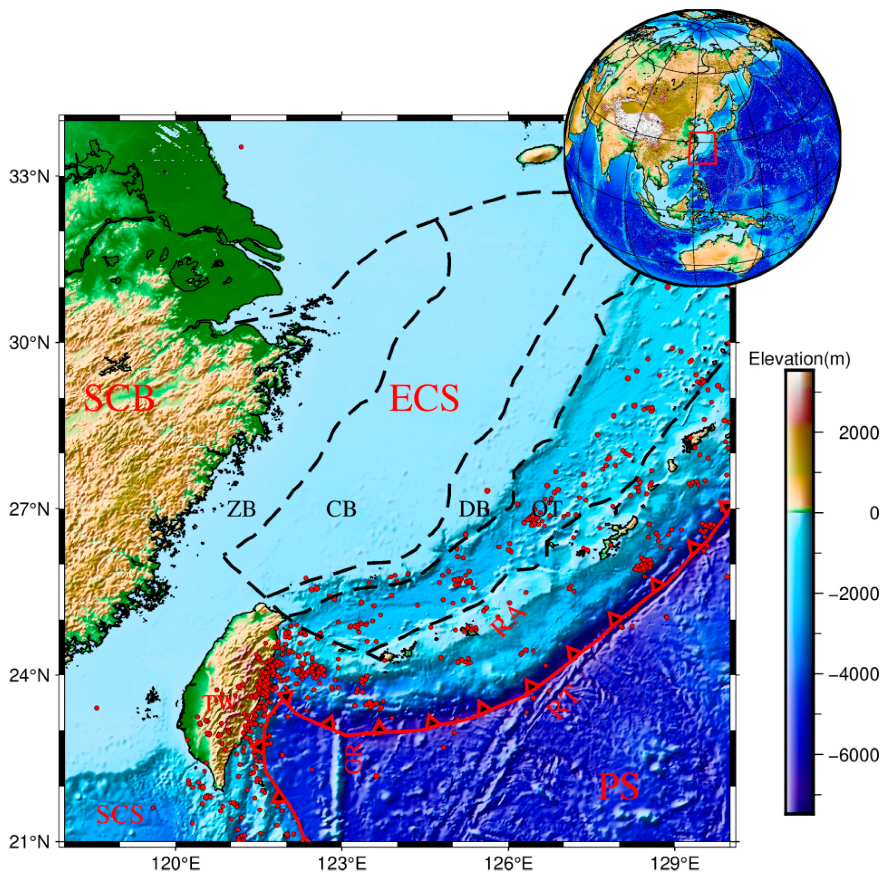 - Nishizawa, A.; Kaneda, K.; Oikawa, M.; Horiuchi, D.; Fujioka, Y.; Okada, C. Seismic Structure of Rifting in the Okinawa Trough, an Active Backarc Basin of the Ryukyu (Nansei-Shoto) Island Arc–Trench System. Earth Planets Space 2019, 71, 21. [Google Scholar] [CrossRef]