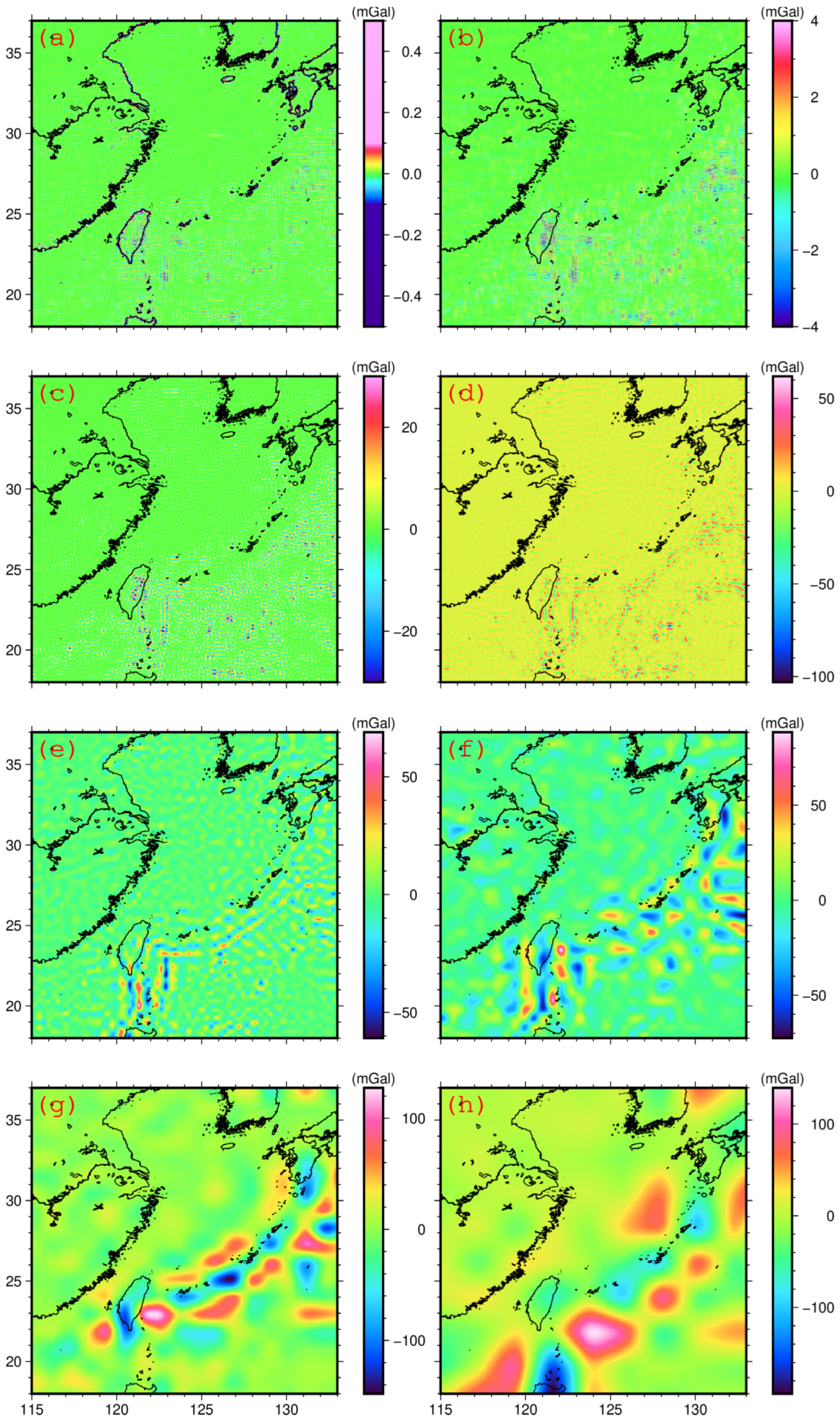- Yu, H.; Wen, M.; Xu, C. Inversion of Moho topography in Taiwan using improved Parker-Oldenburg method. Front. Earth Sci. 2025, 13, 1592768. [Google Scholar] [CrossRef]
