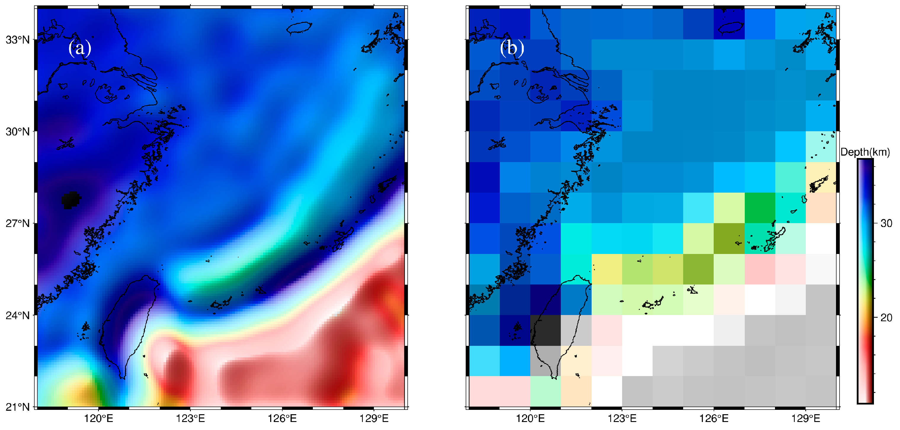 - As a back-arc basin, the Moho topography of the Okinawa Trough is elevated, with depths ranging from 18 to 25 km. However, the Moho fold structure is almost non-existent here. This confirms the point that, in the absence of interplate stresses, it may be upwelling flow in the mantle that contributes to crustal thinning.