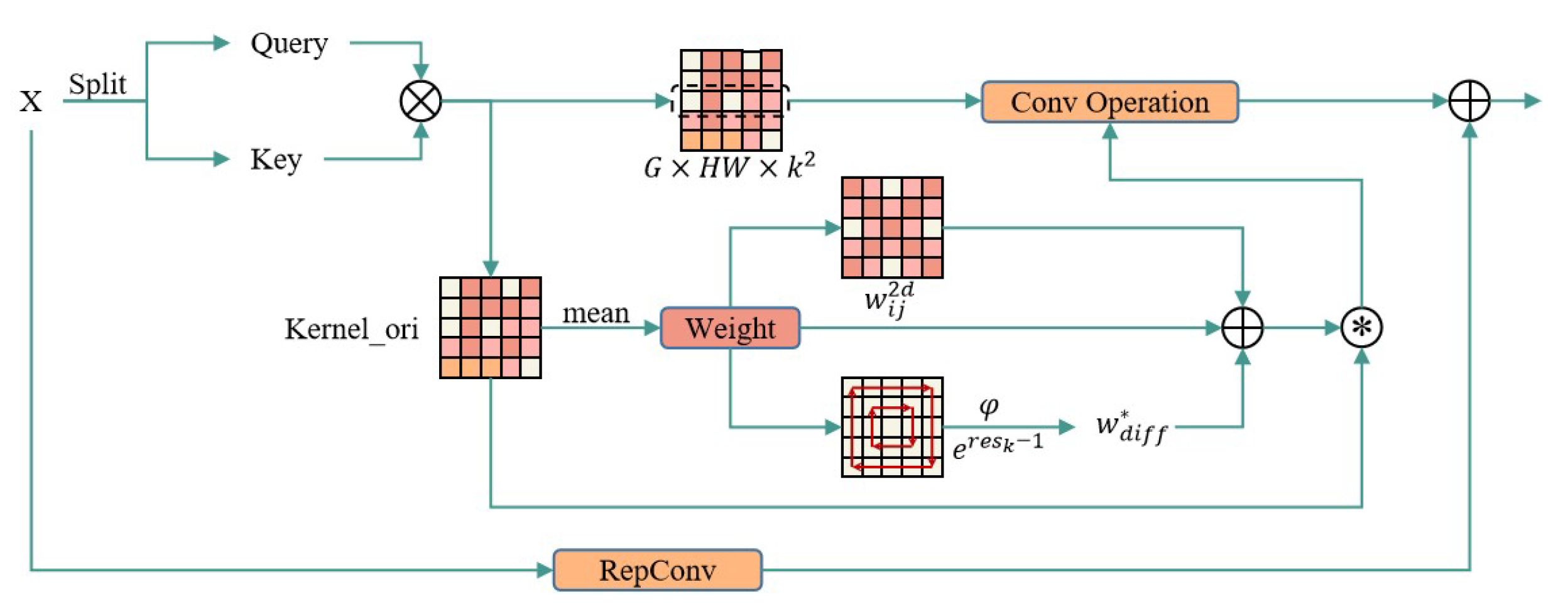 represents the dynamic convolution kernel after applying the kernel space weights. This dynamic convolution kernel not only achieves fine-grained recognition of objects and textures as well as accurate perception of local details under the combined action of