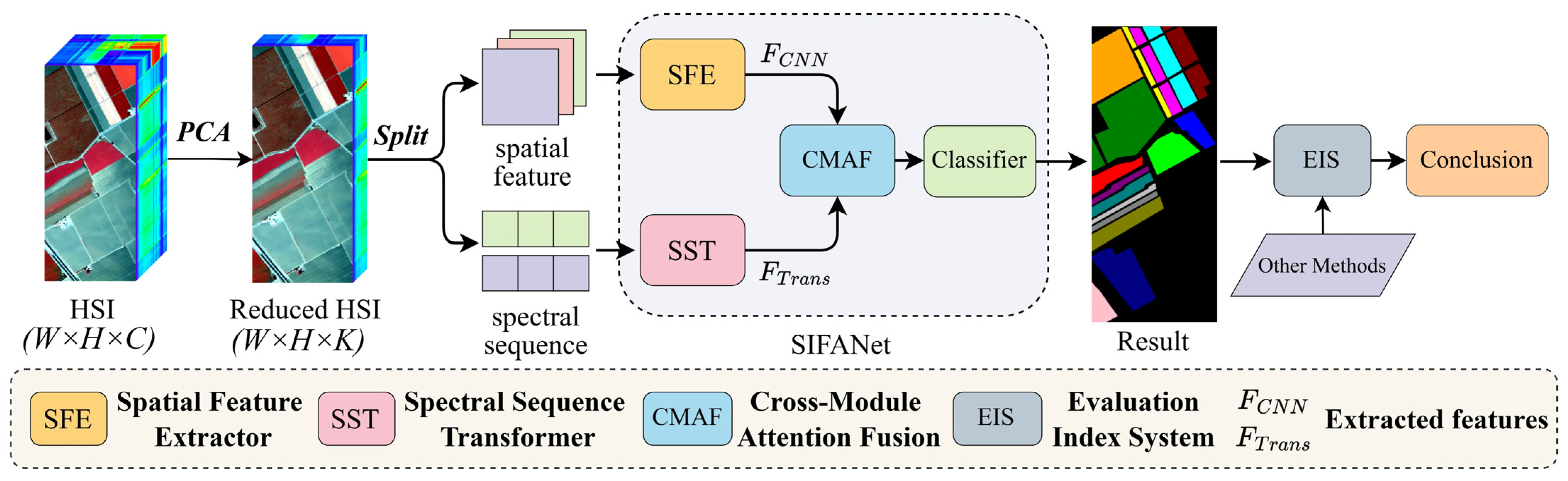 47]. These successes in handling complex, multi-modal remote sensing data provide a strong rationale for adopting a hybrid design to capture both local spatial details and global spectral dependencies in HSI classification. Building on the need for efficiency, this article proposes a dual-branch network called the spectral integration and focused attention network (SIFANet). SIFANet is built on a hybrid CNN–Transformer structure and incorporates a channel attention mechanism to emphasize important spectral bands. By optimizing feature extraction and fusion, SIFANet could improve HSI classification performance and enhance classification accuracy to a certain extent.