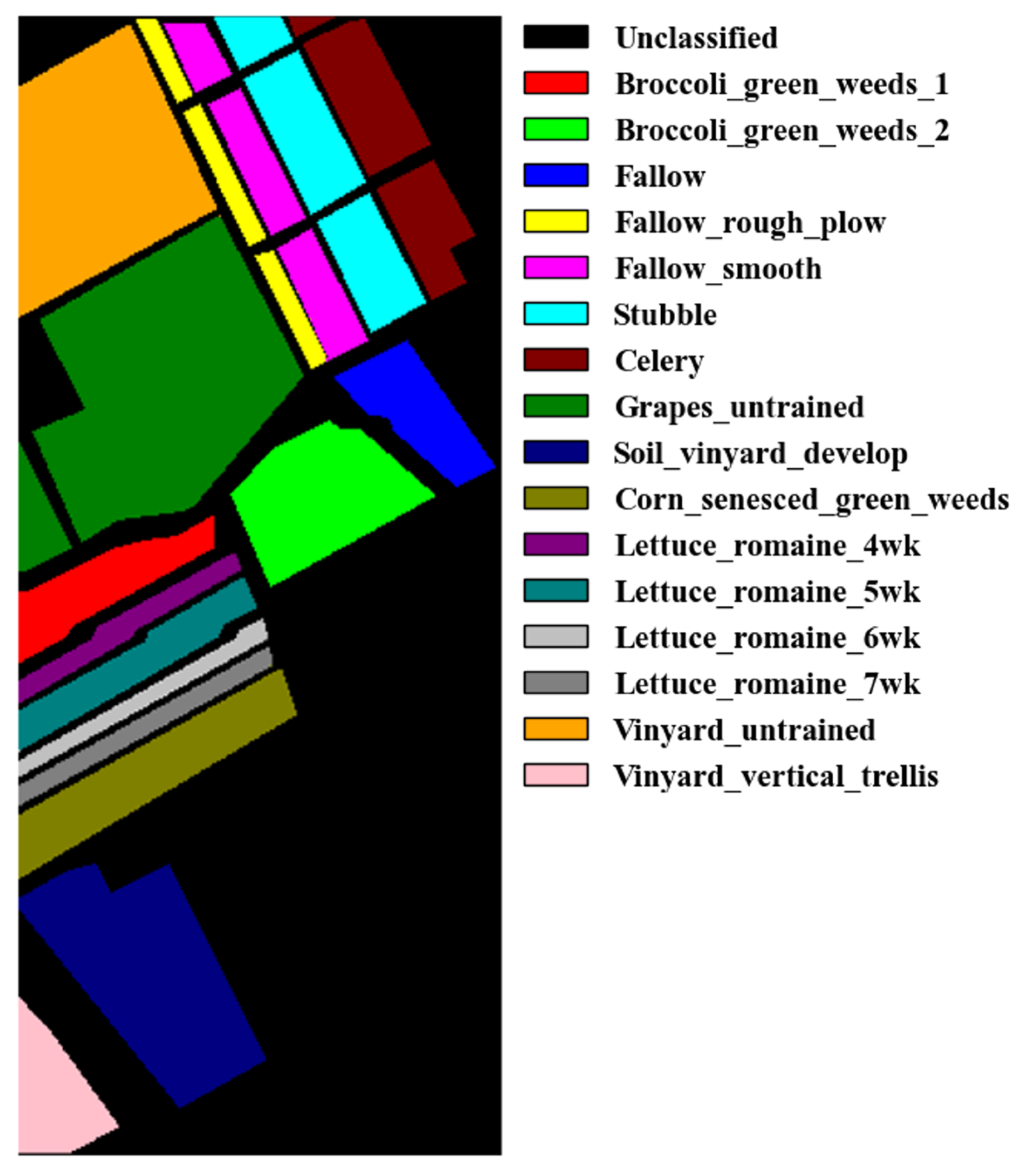 SVM and LSTM, lacking spatial contextual modeling capabilities, display diffusely distributed misclassification. Severe boundary penetration occurs between spectrally similar categories like “Grapes_untrained” and “Vinyard_untrained”, accompanied by noticeable intra-class noise and boundary blurring.