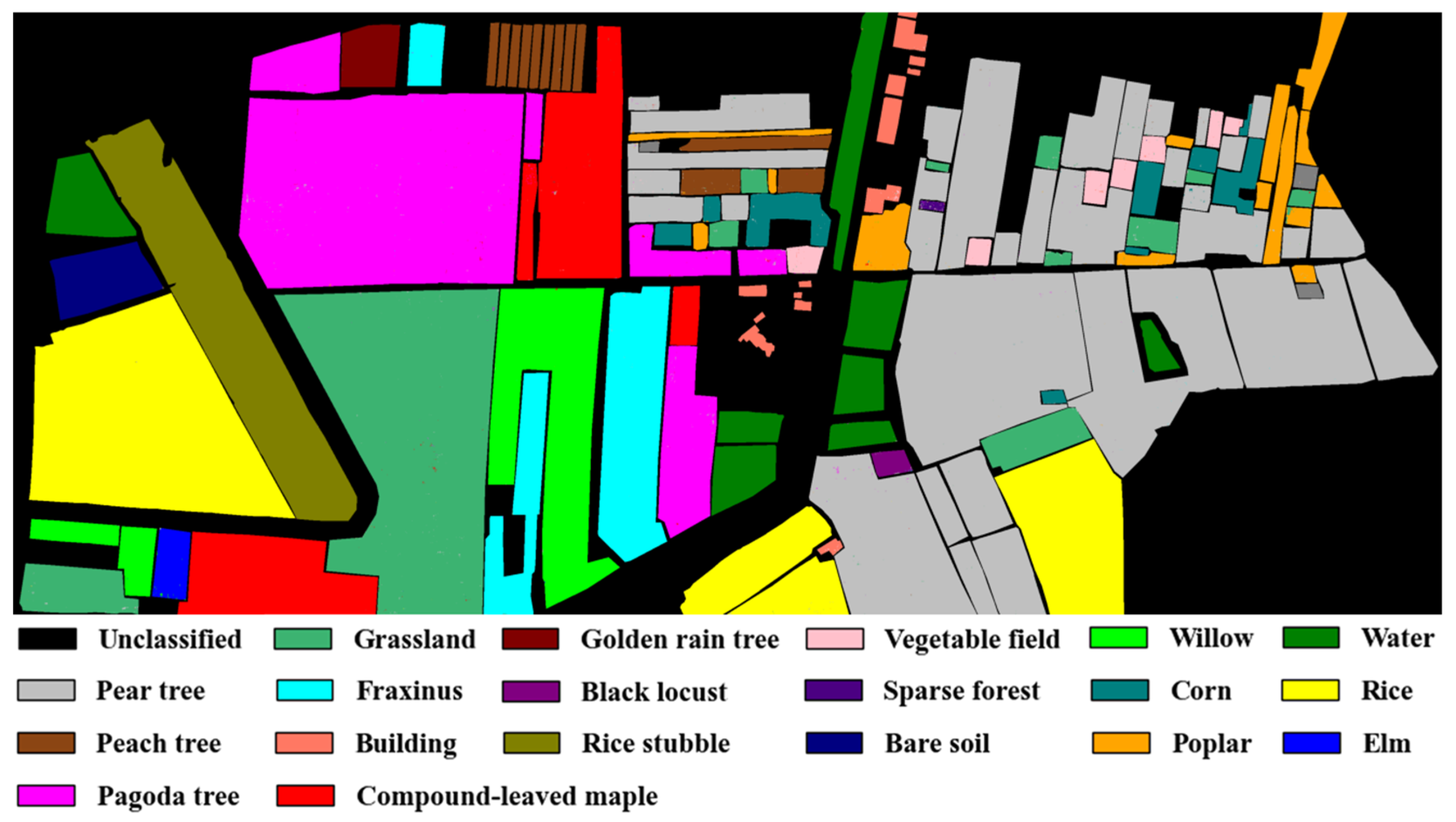17] proposed a hybrid technique which combined tree-based classifiers with feature dimensionality reduction. The results show that decision trees (DTs), extra trees (ETs), and RF perform well in HSI classification.