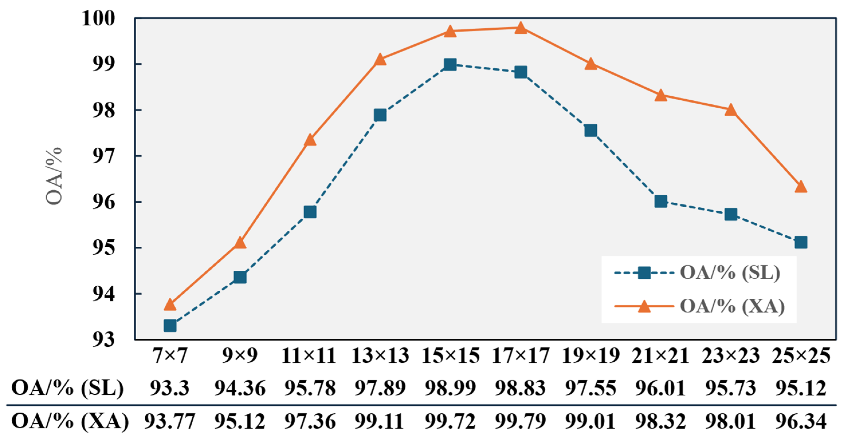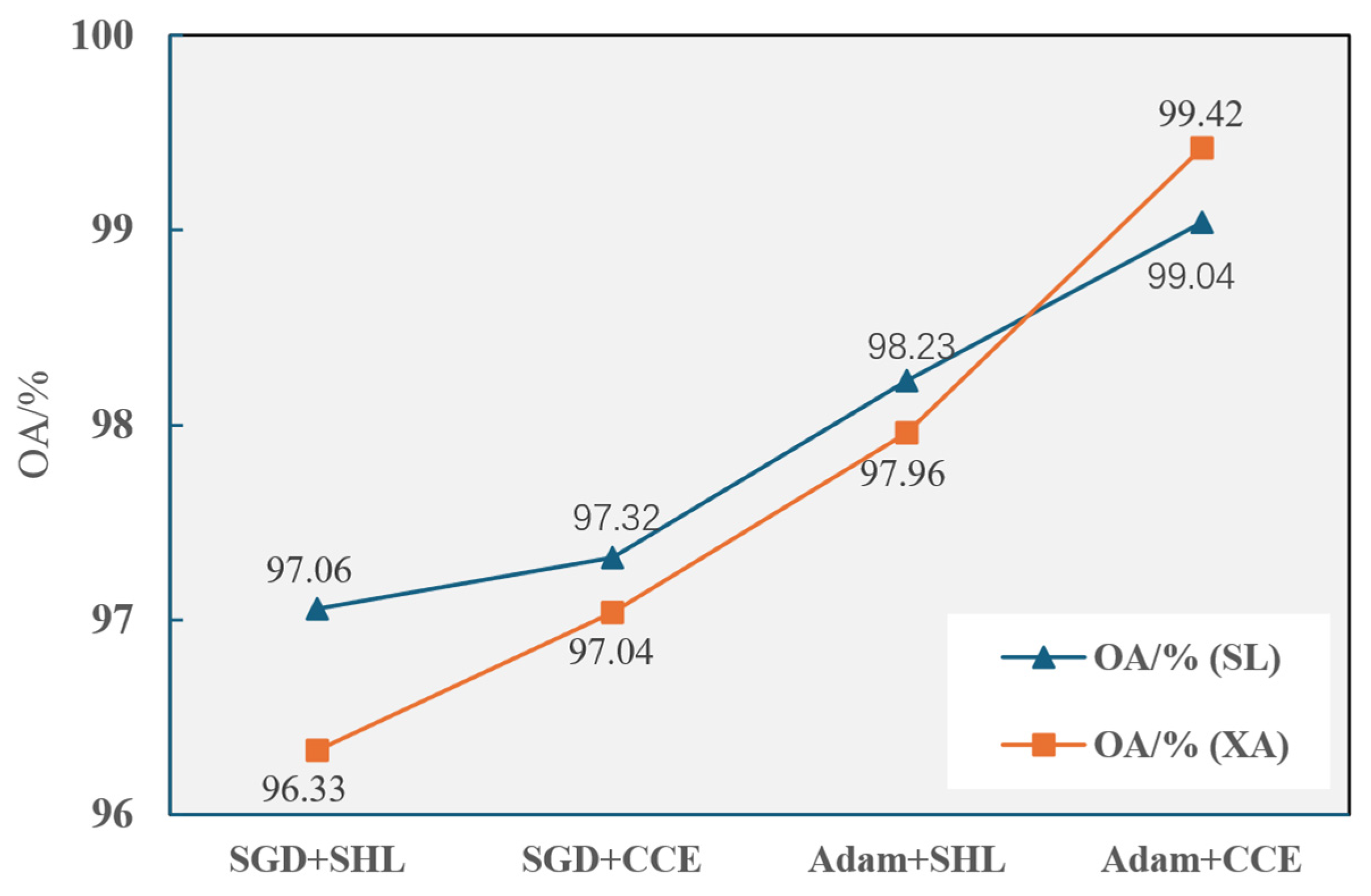 Comparing Experiments 2/3 (“single module + CMAF”) against Experiments 5/6 (“single module only”) shows higher OA and Kappa coefficients for the former, demonstrating CMAF’s ability to extract valuable information from SFE/SST branches while reducing interference from ineffective features. Contrasting Experiment 1 (CMAF) with Experiment 4 (simply Add fusion) confirms that it could achieve complementary spatial–spectral information, improving OA by 4.77% (SL)/4.88% (XA) and Kappa by 5.29% (SL)/5.72% (XA). This superiority stems from CMAF’s attention-driven gating mechanism. Unlike simple element-wise addition, which treats all features with equal importance and may lead to “feature dilution” or noise propagation, the attention-based strategy dynamically re-weights the feature maps. It prioritizes discriminative spatial–spectral components while effectively suppressing redundant or non-informative features from individual branches. This adaptive fusion ensures a more precise alignment and integration of heterogeneous information.