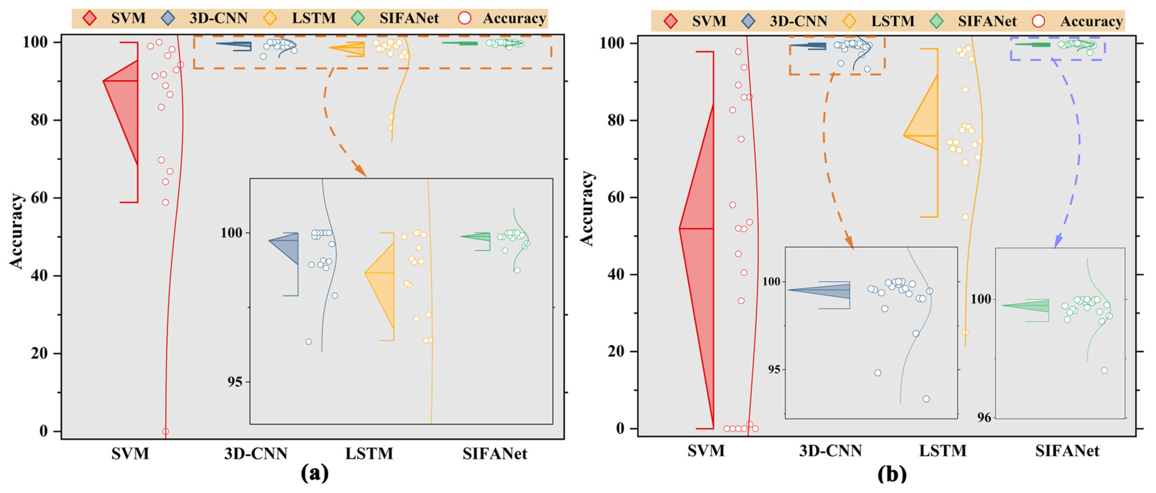 Table 8. Different colors in the table are used to distinguish accuracy comparison results: orange-marked values indicate relative accuracy lower than the SIFANet benchmark. “√” indicates that this structure is enabled in the experiment, while “×” indicates that it is disabled. Experiment 1 served as the baseline control group, incorporating all SFE, SST, and CMAF modules. The experimental design followed a progressive decoupling approach to analyze module interactions.
