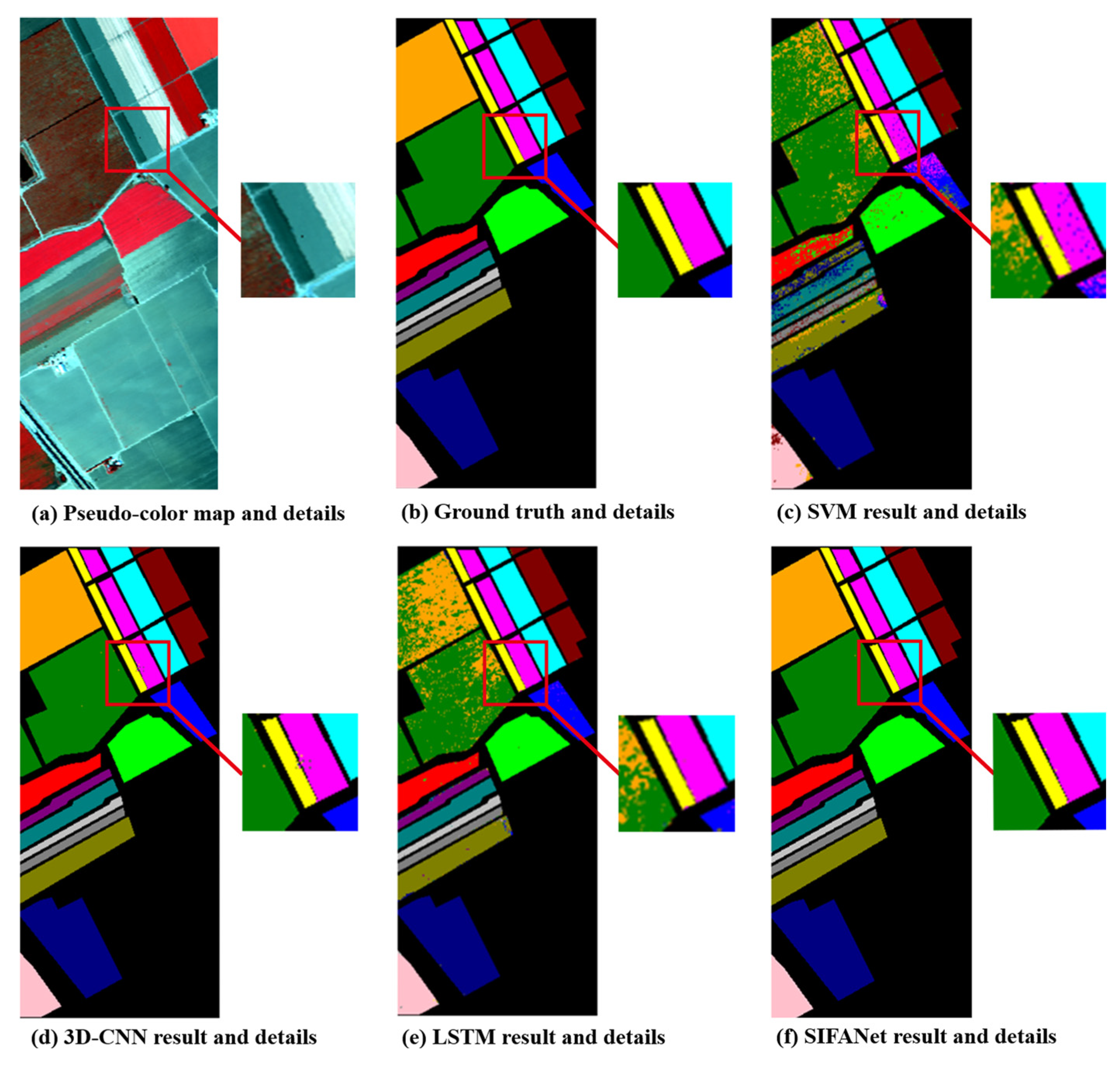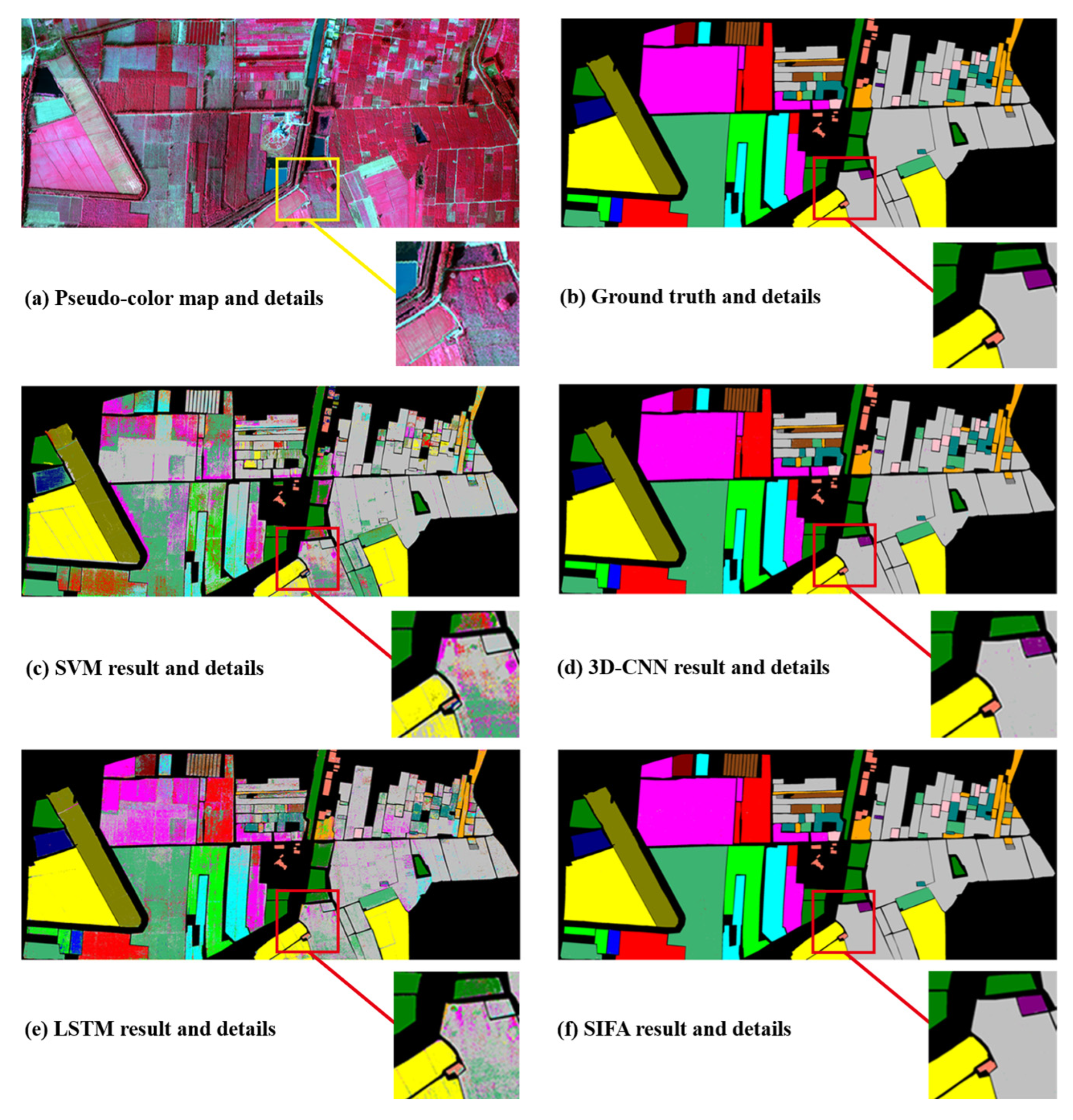 In contrast, SIFANet maintains continuous, clear category boundaries and smooth homogeneous regions in the detailed views. The results validate the effectiveness of the model’s structure design. The spatial–spectral dual-branch could extract complementary features, where residual blocks in the SFE branch effectively alleviate vanishing gradients in deep networks. Concurrently, the Conv-Former module enhances spectral sequence modeling capability. Ultimately, the CMAF module achieves the dynamic adaptive fusion of dual-branch features, minimizing information loss during feature transmission.