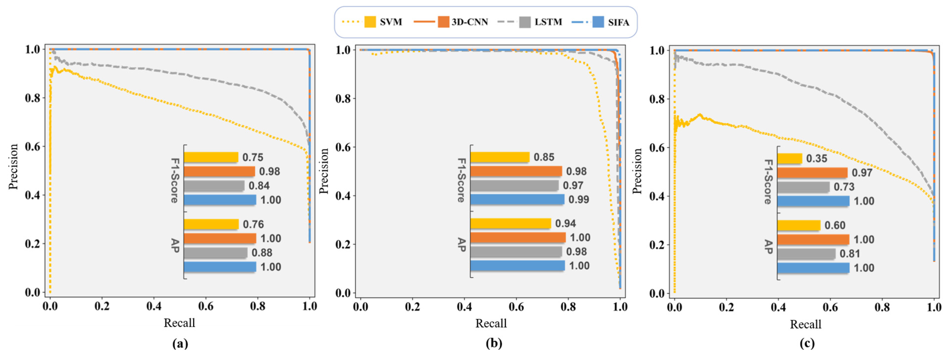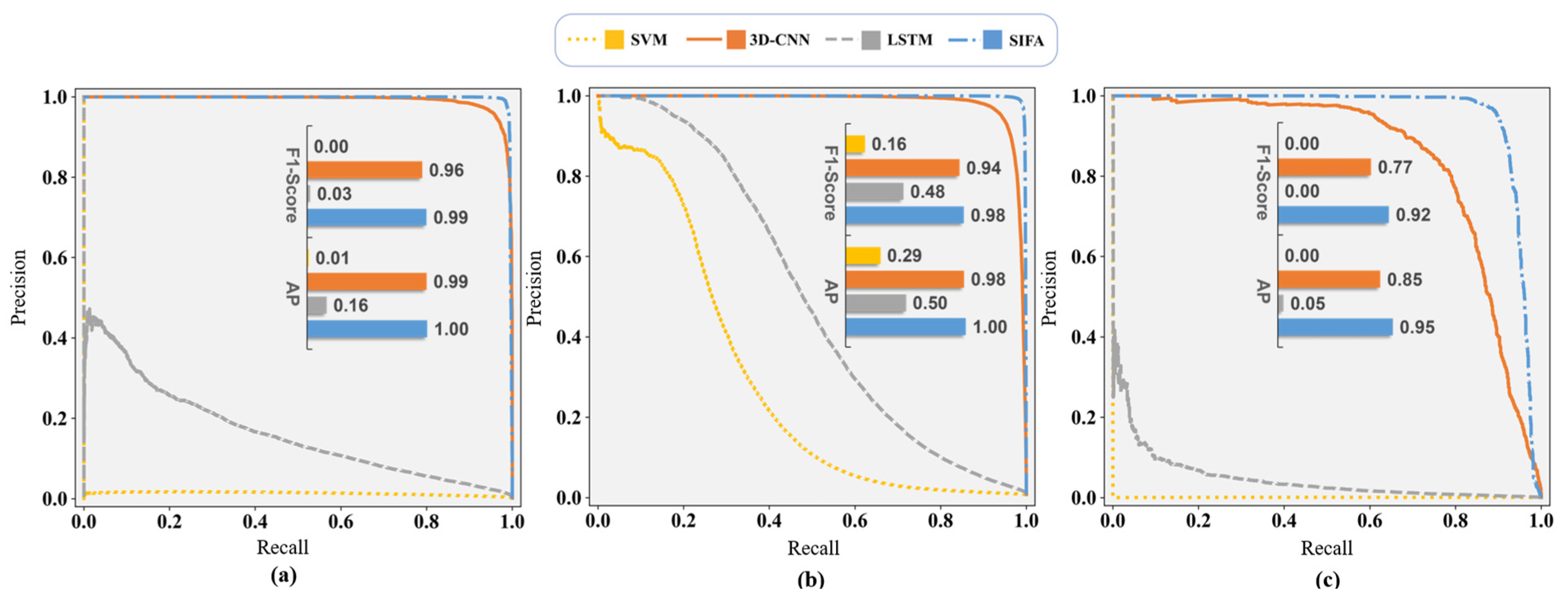 F1-Score and AP values validate PRC observations. SIFANet consistently achieves optimal performance in imbalanced datasets, demonstrating robust results: F1-Score > 0.99 and saturated AP values across all Salinas categories, while maintaining > 0.92 F1-Score and >0.95 AP in Xiong’an dataset. Though 3D-CNN performs second best in most scenes, its F1-Score and AP decrease markedly (20.3% and 14.5%, respectively) when processing challenging features like “Sparse Forest” compared to other confusing categories. SVM and LSTM perform notably worse in the Xiong’an dataset with the F1-Score and AP dropping below 0.5 and even reaching zero for categories like “Black locust” and “Sparse Forest”.