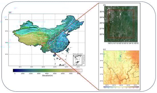 (a) Topographic elevation distribution across China. The red dashed rectangle delineates the study area selected for this research. (b) The topographic map of the remote sensing data of the selected research area. (c) Spatial distribution of the surface 2 m temperature dataset within the study area.