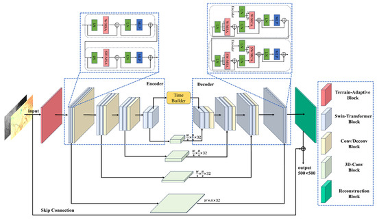 The TAUT framework comprises three core components: an encoder, a decoder, and a time builder. The encoder extracts multi-level features from the input data, whereas the decoder reconstructs these features to generate the final output. Both the encoder and decoder employ a series of Swin Transformer blocks alongside convolutional layers, with the encoder using standard convolutions and the decoder using deconvolutions. Specifically, the Swin Transformer is responsible for hierarchical feature extraction and reconstruction, while the convolutional and deconvolutional layers perform downsampling and upsampling, respectively. Features from multiple encoder stages are further integrated via 3D convolutions before being passed to the decoder. Meanwhile, the time builder generates time-aware tensors and injects them into the decoder to support sequence-aware reconstruction. The following section details each module and the training procedure.