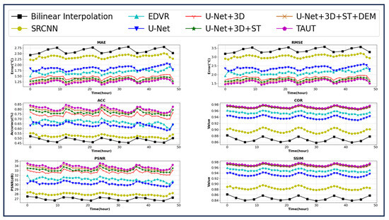 Figure 5 shows the changes in the mean values of the hourly evaluation indicators of each model over time within the 48 h downscaling period. As shown in the figure, the TAUT model maintains the smallest mean absolute error (MAE) and root mean square error (RMSE) across all timings, and the other evaluation indicators are also consistently superior to those of the comparison models. The distribution of the indicators of each model over time is basically consistent with the overall average presented in Table 5. Only the U-Net model and the EDVR model show curve crossover at a few moments.