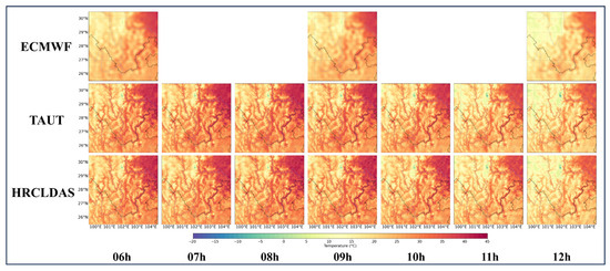 The distributions of 2 m temperature on the downscaling time of 06–12 h, including ECMWF, HRCLDAS, and the downscaling results obtained by TAUT.