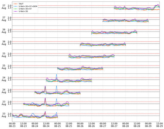 Figure 11 shows the time series of root mean square error (MAE) for 48 h 2 m temperature downscaling by each ablation model from 23 to 27 August 2024. Each point in the figure represents the average value of the error within the study area during that hour. The accuracy threshold Settings in the previous text are the same. In the figure, an MAE above 2.0 °C (red dotted line) is set as a situation with a relatively large error, while an MAE below 1.5 °C (black dotted line) is set as a situation with a relatively small error. Analysis shows that in the study of this high-temperature case, the model (purple line) that only introduces 3D convolution has the largest error and the least satisfactory downscaling effect. After adding the Swin Transformer module (green line), the error was significantly reduced and basically stabilized below the 1.5 °C threshold, but its performance was still inferior to the subsequent two model configurations. After further introducing terrain as an auxiliary variable, the downscaling effect of the model improved in some periods (mainly the last three days), but the overall performance was unstable. For example, in the downscaling results on 23 August, there was a large fluctuation in error. After the MBTA module was added, the downscaling performance of the model in the following days was different from that of the model without this module, but the error was basically controlled below the 1.5 °C line. In the early downscaling, the model with the MBTA module added demonstrated better stability and lower error values. In conclusion, in the downscaling prediction of extreme high temperatures in this study area, the fully constructed TAUT model achieved the best comprehensive performance.