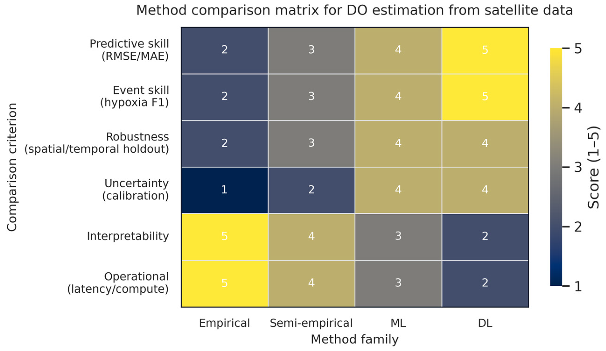- Satellite remote sensing can effectively estimate surface dissolved oxygen using empirical, semi-empirical, machine learning, and deep learning approaches.