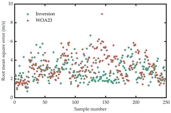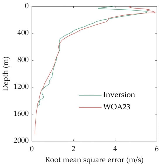 Figure 3 presents the reconstruction errors of all 247 profiles. A comparison is made between the inversion errors and those of the WOA23 profiles. It can be observed that the reconstruction errors of the vast majority of the inversion cases are smaller than those of the WOA23 profiles. Specifically, the average reconstruction error of the inversion is 2.85 m/s, while the average error of the WOA23 profiles is 3.26 m/s. In the absence of any in situ measurements, the error is decreased by approximately 13% via inversion processing when compared to directly using the WOA23 data. Typically, a root mean square error exceeding 4.5 m/s is regarded as a relatively large error result. When directly applying WOA23, the proportion of such cases reaches 16%. However, after inversion processing, this proportion decreases to 6%. From the perspective of reconstruction error, the inversion reconstruction method proposed in this paper is effective. By integrating data-driven approaches, the profiles obtained through inversion are closer to the actual sound speed distribution than the climatological mean profiles.