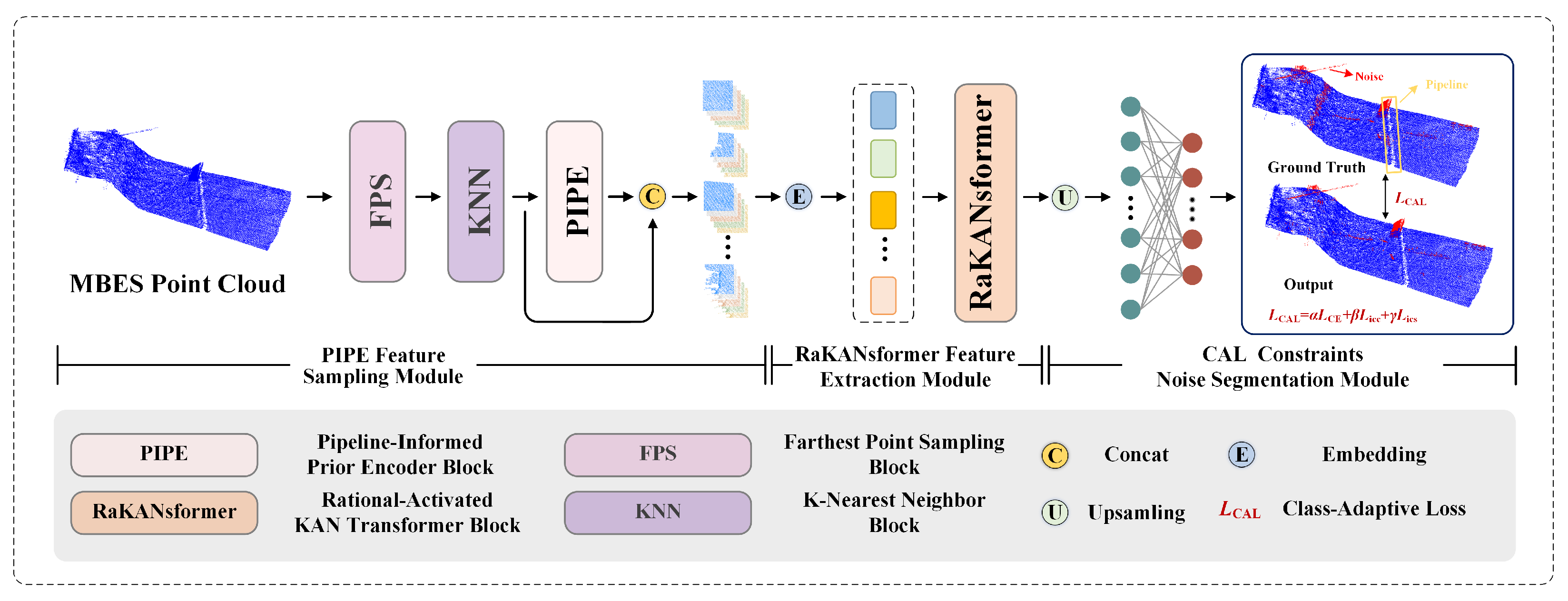 - High-precision and robust MBES point-cloud noise segmentation in complex seabed environments is achieved through the pipeline-informed prior encoder (PIPE) feature-sampling module, the rational-activation Kolmogorov–Arnold network Transformer (RaKANsformer) feature-extraction module, and the class-adaptive loss (CAL)-constrained noise-segmentation module.