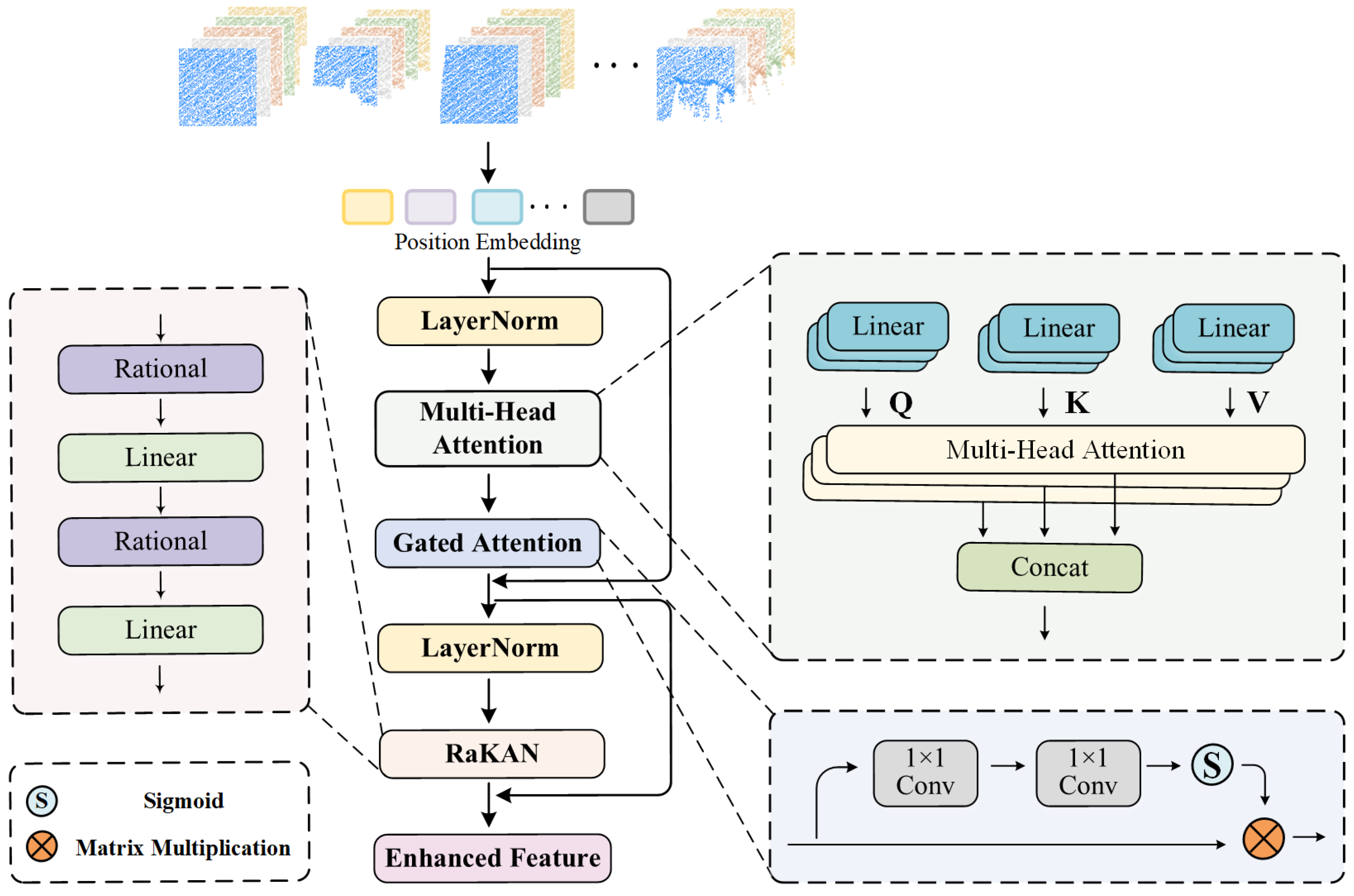- To address the insufficient nonlinear representation and weak interpretability of existing models in complex seafloor environments, this paper proposes a rational-activated KAN transformer (RaKANsformer) feature extraction module. This module leverages self-attention to fully model the global dependencies of point clouds, employs gated attention to highlight salient features, and integrates the rational-activated KAN (RaKAN) block as its nonlinear modeling component. Compared with conventional piecewise-linear activations, the rational activation provides higher curvature expressiveness with a stable response to extreme inputs, making it better suited for modeling the coexistence of regular pipeline geometry and irregular geometric disturbances in MBES point clouds.