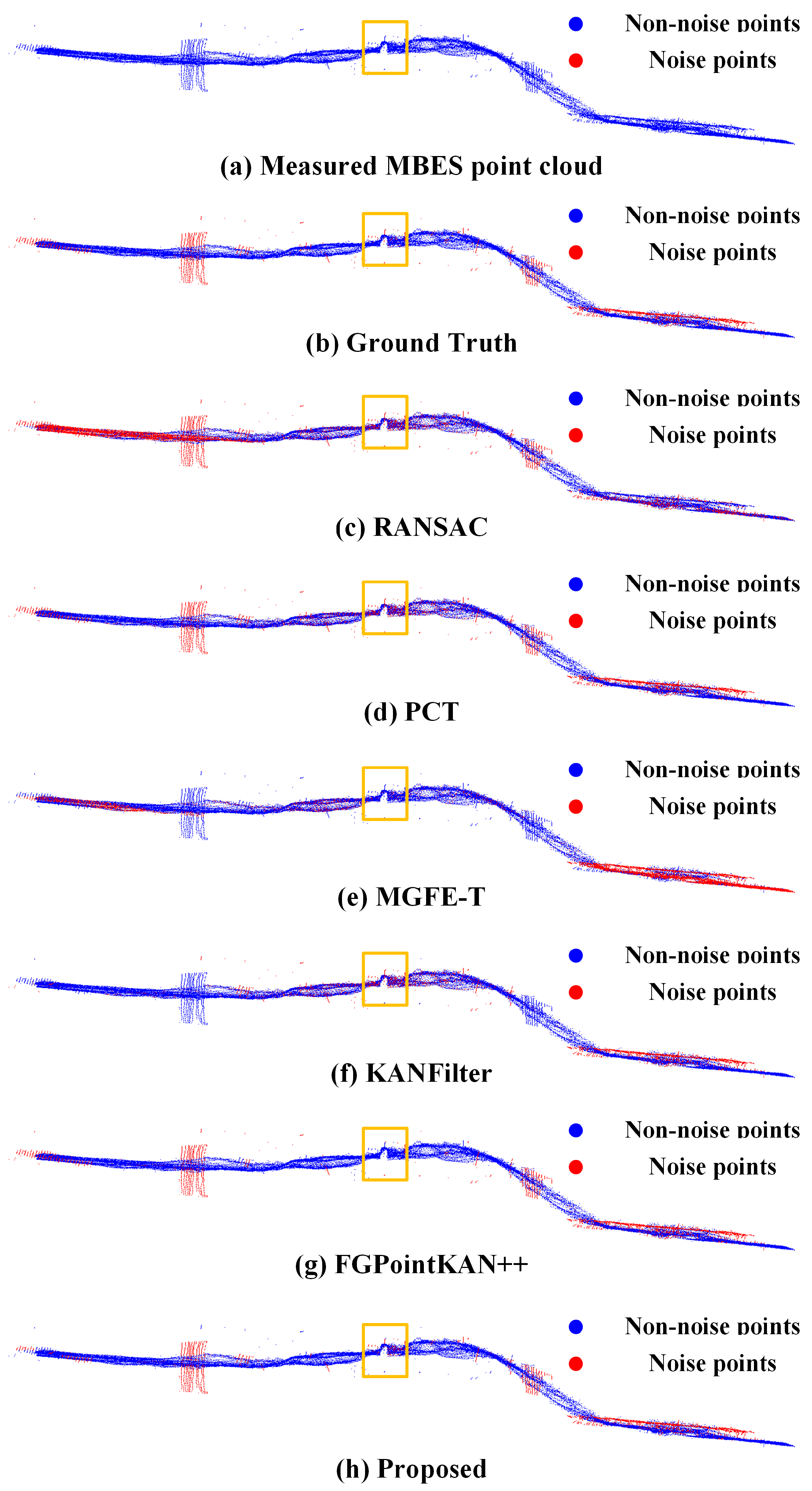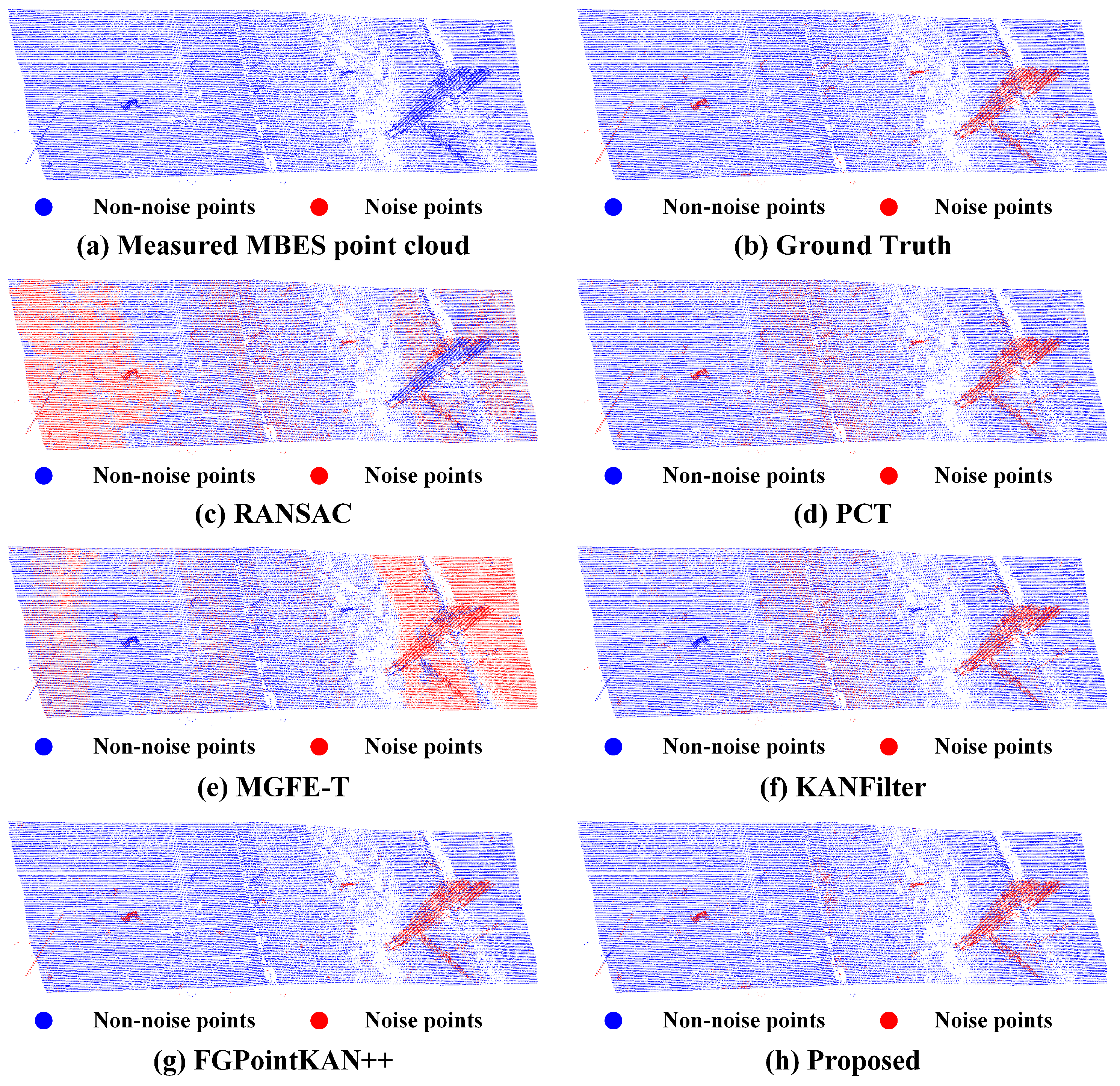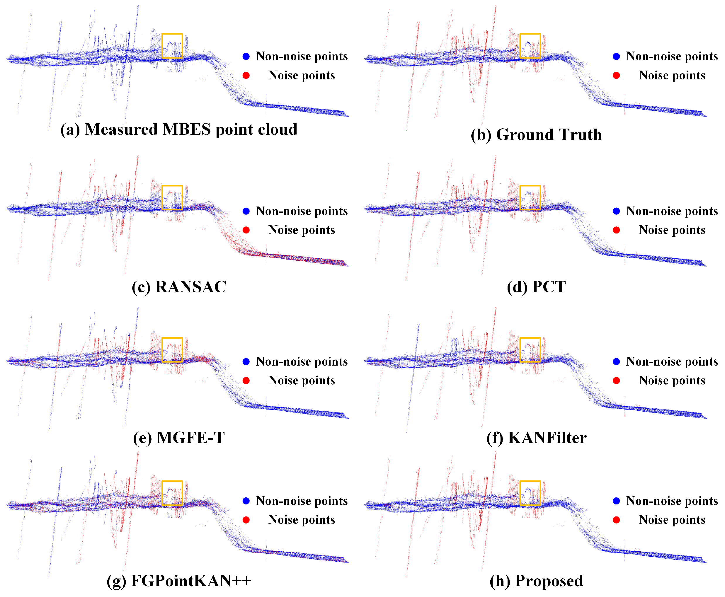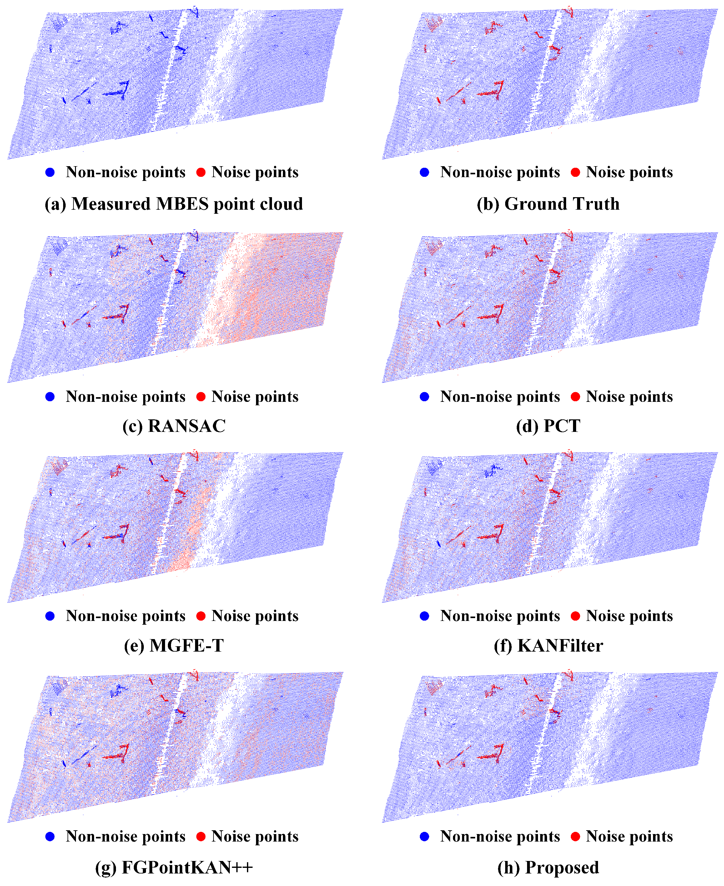- To address class imbalance between noise points and non-noise points, which often leads to missed detections and misclassifications, we propose a class-adaptive loss (CAL) constraints noise-segmentation module. By establishing intra-class consistency loss (LICC) and inter-class separation loss (LICS) through neighborhood consistency-based graph smoothing constraints and local support degree-based outlier penalty mechanisms, the problem of mis-detection and missed detection caused by the imbalance of noise points and non-noise points in MBES point clouds is effectively alleviated.