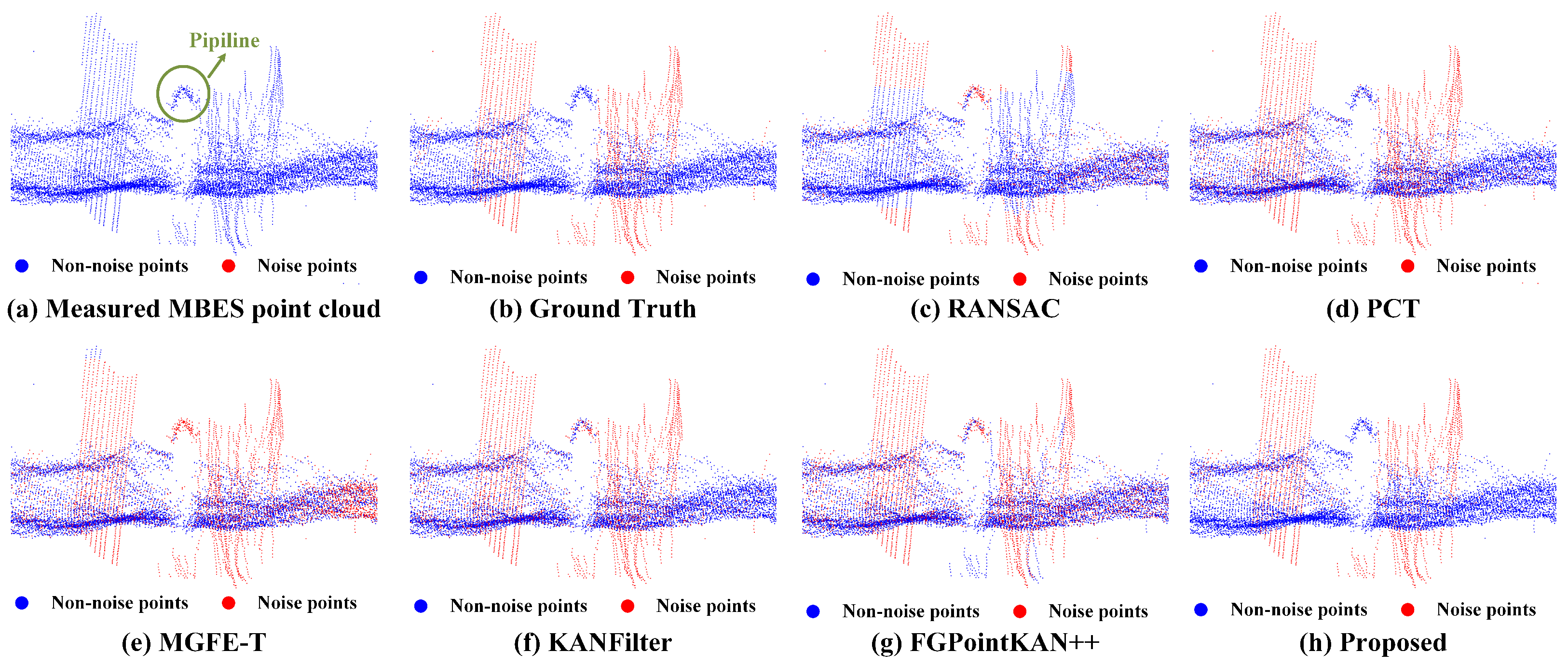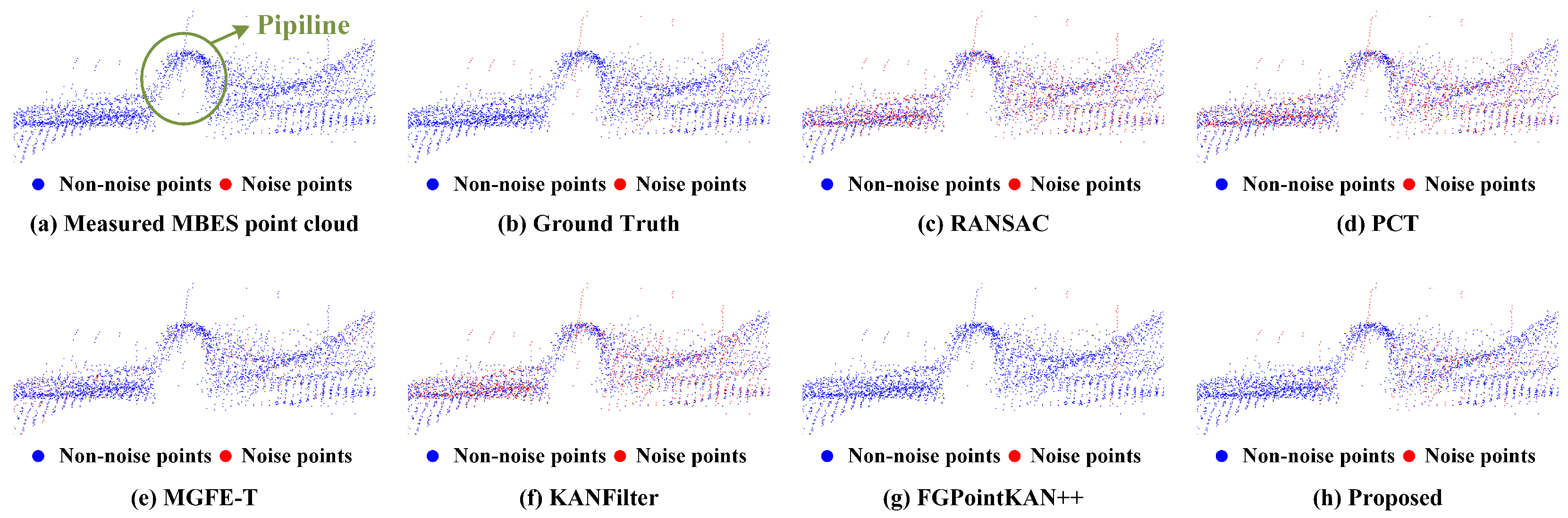 - The PIPE feature sampling module extracts pipeline geometric priors to enhance the separability between pipeline and noise points; the RaKANsformer feature extraction module strengthens feature extraction through self-attention, gated attention, and rational activations; and the CAL constraint noise segmentation module mitigates false and missed detections arising from class imbalance in MBES point-cloud data via class-adaptive weighting.