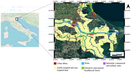 The Area of Interest (AoI) for the present study is located in Emilia Romagna, Italy, and is depicted in Figure 1. The geographical coordinates of the AoI central point are 44.96°N and 12.33°E, and the area extends for about 1.179 km2. The chosen site is included in the framework of PAM zones, being both an N2K site and a riparian zone, considering that it has experienced several natural disasters in recent years, including heavy flooding and landslides. Moreover, the morphology of the selected AoI, which is characterized by flat areas, reduces layover and speckle effects that affect SAR images’ interpretability, thus representing a good training ground to characterize the potential added value of SAR images to the classification task.