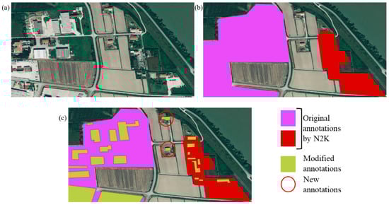 Example of corrected annotation on a zoom view of the AoI: (a) Google Earth image; (b) annotation taken from N2K dataset; (c) example of manual and new annotations.