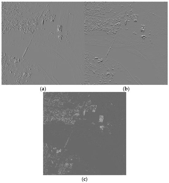 Wavelet Transform (WT) is a widely used tool in computational harmonic analysis, known for its ability to provide localization in both the spatial and frequency domains. A key feature of WT is its capacity for multiresolution analysis, enabling efficient performance in applications such as data compression and denoising. Moreover, WT is excellent in highlighting local changes in the image, such as rapid intensity transitions, i.e., edges, anomalies, or rare details [38,39]. Within this framework, the Stationary Wavelet Transform (SWT) is specifically chosen to extract spatial and frequency features from the original products. With respect to WT, SWT does not reduce the size of coefficients during the extraction. This preserves spatial information and facilitates the reuse of coefficients to extract detailed features without loss of data. This is essential in dataset construction, as it preserves the size of the original images. In this study, the original products coming from CSG and PLT-1 are analyzed at different scale levels to extract texture information useful in classification and pattern recognition. SWT decomposes the three images into a series of layers, each representing image features at different frequency scales. In particular, each original image is decomposed into four different layers: low–low frequency (LLF), low–high frequency (LHF), high–low frequency (HLF), and high–high frequency (HHF). This decomposition makes it possible to identify fine high-frequency details such as edges and contours, as well as global low-frequency structures such as general shapes or textures. In this framework, SWT is applied to extract multiscale features that highlight edges (e.g., perimeters of buildings or streets) and textures (to distinguish water, vegetation, and urban areas). The extracted 12 coefficients and different layers, 4 for each original image, are inserted within the dataset and will correspond to additional features useful to training the XGBoost model. The example of the four contributions, extracted from the first product listed in Table 1, is depicted in Figure 8.