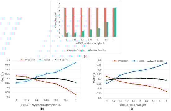Comparison between SMOTE and scale_pos_weight use: (a) histogram of negative and positive class samples (the symbol # indicate the number); (b,c) comparison of Precision, Recall, and F1 score metrics under varying synthetic data generation and scale_pos_weight.