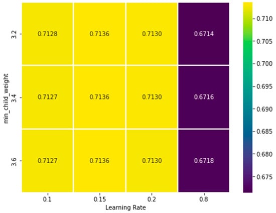 The heatmap shown in Figure 11 illustrates that the best F1 scores are obtained when learning_rate is set between 0.1 and 0.2, combined with min_child_weight around 3.2. For example, increasing learning_rate from 0.1 to 0.8, while keeping min_child_weight fixed, reduces the model stability and leads to a noticeable decrease in F1 score. Similarly, setting min_child_weight above 3.6 constrains tree growth too strongly, preventing the model from capturing smaller urban objects and leading to more false negatives.