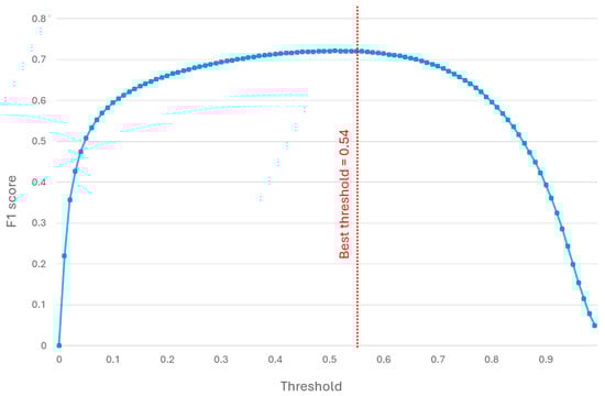 In machine learning models, and particularly in XGBoost, the prediction is returned in the form of a probability associated with the positive class. To convert this probability into a binary decision (class 0 or class 1), a classification threshold must be defined. By default, XGBoost uses a threshold of 0.5, which means that an observation is classified as “positive” if the predicted probability is greater than or equal to 0.5; otherwise, it is classified as “negative”. However, this threshold is not always the optimal choice, because in many applications the balance between Precision and Recall is crucial. In this context, in parallel with hyperparameter tuning, a further analysis has been conducted to optimize the classification threshold, aiming to achieve the best trade-off between these two metrics by maximizing the F1 score. Moreover, adjusting the threshold is particularly beneficial when dealing with imbalanced datasets, as it can enhance the recognition of the minority class. Threshold optimization was carried out by evaluating different threshold values and selecting the one that maximized the metric of interest, the F1 score. Specifically, Figure 12 illustrates the adopted strategy, where a variable threshold has been tested between 0 and 1, with a step size of 0.01.