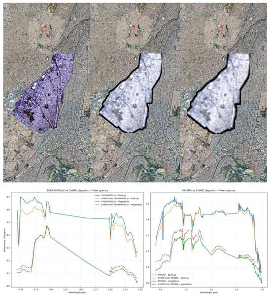 Upper row, from left to right: original THERMOPOLIS-2009 false color image with CHIME-mimicked bands but 4 m spatial resolution, the same area after Gaussian filtering, and the final CHIME-like product (filtered and with resampling to 30 m) spatial resolution for the Sepolia neighborhood in Athens. Lower row: THERMOPOLIS-2009 and PRISMA original and CHIME-like spectra for two points, one characterized by artificial urban materials, and one covered by vegetation.