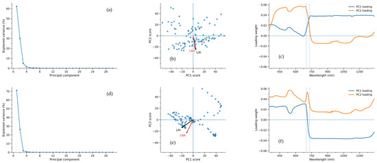 Canopy hyperspectral PCA for 2021 (a–c) and 2020 (d–f): explained variance (a,d), PC scores with LAI/LNA directions (b,e), and PC loading spectra (c,f).