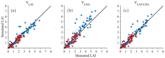 Relationship between simulated and measured LAI values (Black line: 1:1 Line; Blue dots: 2021 year; Red dots: 2020 year) for: (a) LAI as the state variable (VLAI); (b) LNA as the state variable (VLNA); (c) both LAI and LNA as state variables (VLAI+LNA).
