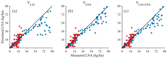 Relationship between simulated and measured LNA values (Black line: 1:1 Line; Blue dots: 2021 year; Red dots: 2020 year) for: (a) LAI as the state variable (VLAI); (b) LNA as the state variable (VLNA); (c) both LAI and LNA as state variables (VLAI+LNA).