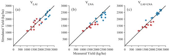 Relationship between simulated and measured yield values (Black line: 1:1 Line; Blue dots: 2021 year; Red dots: 2020 year) for: (a) LAI as the state variable (VLAI); (b) LNA as the state variable (VLNA); (c) both LAI and LNA as state variables (VLAI+LNA).
