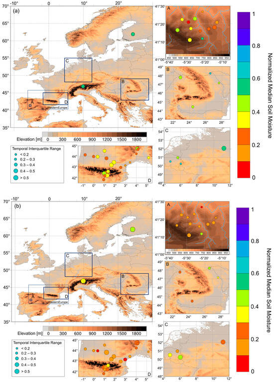 Normalized temporal median in situ soil wetness index in the top soil layer (0–6 cm) of each station of the growing periods (March–September). (a) 2021; (b) 2022. Coloring of the markers denotes the median soil moisture content, whereas the marker size indicates the temporal interquartile range over the growing period. The background map shows the elevation based on the EU-DEM 25. In situ measuring stations of the following networks are shown in A: REMEDHUS, B: RSMN, C: ICOS, and D: XMS-CAT, SMOSMANIA, and ICOS.