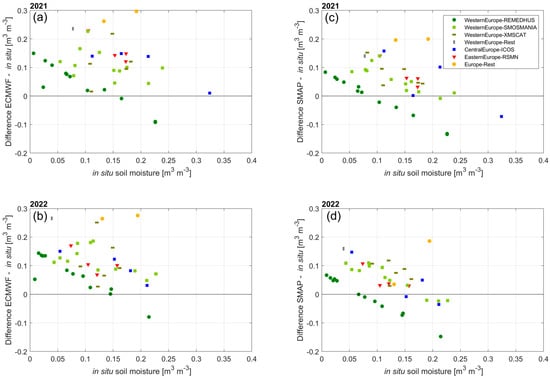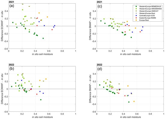 Median station soil moisture plotted against the difference between the median of the in situ measurement and the median of the ECMWF time series in 2021 (a) and 2022 (b). Subplots (c,d) show the same for the difference in medians between in situ and SMAP DCA. The different markers denote the region and network of each station.