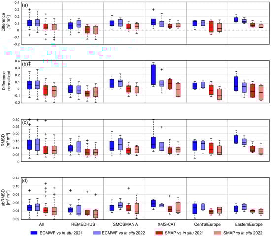 Detailed statistics of the time series. (a) Differences in absolute soil moisture content [m3m−3]; (b) difference in normalized soil moisture; (c) RMSD of the absolute soil moisture contents; (d) unbiased RMSD of the absolute soil moisture contents. The colors indicate the dataset. Blue: ECMWF vs. in situ 2021, pale blue: ECMWF vs. in situ 2022, red: SMAP DCA vs. in situ 2021, pale red: SMAP DCA vs. in situ 2022. Dashed whiskers represent 2.7 times the standard deviation and plus sign indicates outliers.