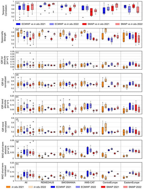 Statistics of the time series temporal variability. (a) Pearson correlation coefficient; (b) seasonality strength; (c) interquartile range of the full time series of soil moisture content; (d) interquartile range of the full time series of the normalized soil moisture; (e) interquartile range of the seasonality of soil moisture content; (f) interquartile range of the seasonality of the normalized soil moisture; (g) median absolute deviation of short-term fluctuations—soil moisture content; and (h) median absolute deviation of short-term fluctuations—normalized soil moisture. The colors indicate the dataset. Blue: ECMWF 2021, pale blue: ECMWF 2022, red: SMAP DCA 2021, pale red: SMAP DCA 2022, in situ 2021: dark orange, in situ 2022: pale orange. In (a), the colors represent the respective dataset compared against the in situ time series of the same year. Dashed whiskers represent 2.7 times the standard deviation and plus sign indicates outliers.