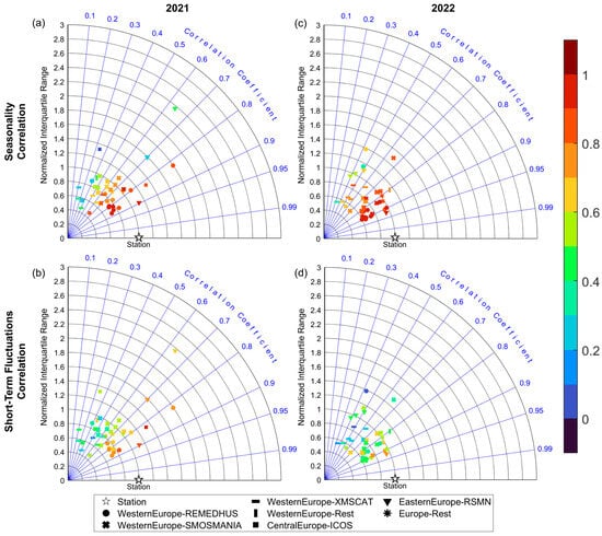 Polar plot depicting the similarity of the full time series of the in situ observations with the respective cell in the ECMWF operational analysis. (a) Depicts the comparison in terms of the normalized interquartile ranges and the temporal correlation coefficients of the full time series between ECMWF and the in situ observations for the growing period 2021. The different markers indicate the focus region. In Western Europe, the markers additionally distinguish the three networks. The colors represent the Pearson correlation coefficient between the seasonality of the in situ observation and the cell from the ECMWF analysis. (b) Shows the same data points as (a), but they are colored in terms of the correlation between the time series of the short-term variability from in situ and ECMWF analysis. (c,d) Show the same configuration but for the growing period 2022.