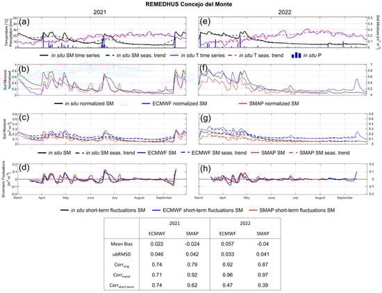 Decomposed 3-day running mean time series of soil moisture and air temperature, as well as daily accumulated precipitation, at the REMEDHUS station, Concejo del Monte. The top row shows the 3-day running mean in situ soil moisture (black, solid) and temperature (purple, solid), their seasonality (dashed), and daily accumulated precipitation. The second row shows the normalized soil moisture time series of the in situ station (black), the cell in ECMWF (blue), and SMAP DCA (red). The third row shows the in situ soil moisture time series and seasonality plotted against those of the cells in ECMWF (blue) and SMAP DCA (red), containing the in situ station. The bottom row shows the short-term variability of all time series plotted against each other. The left plots show the growing period of 2021 (a–d), and the right plots show the growing period of 2022 (e–h).