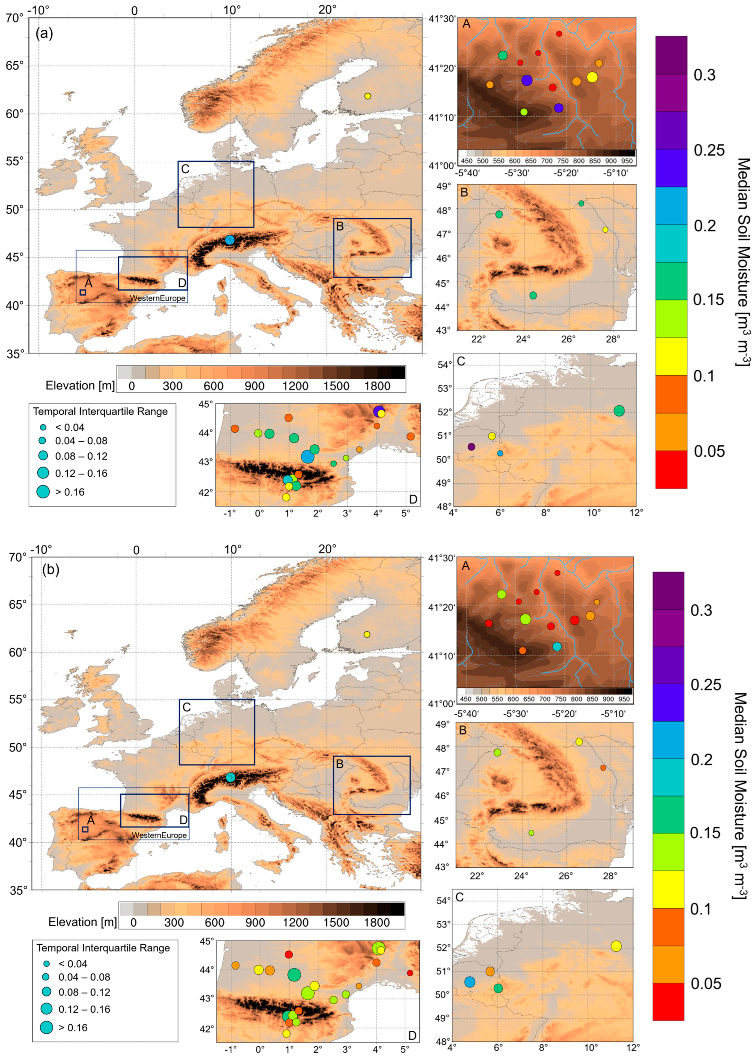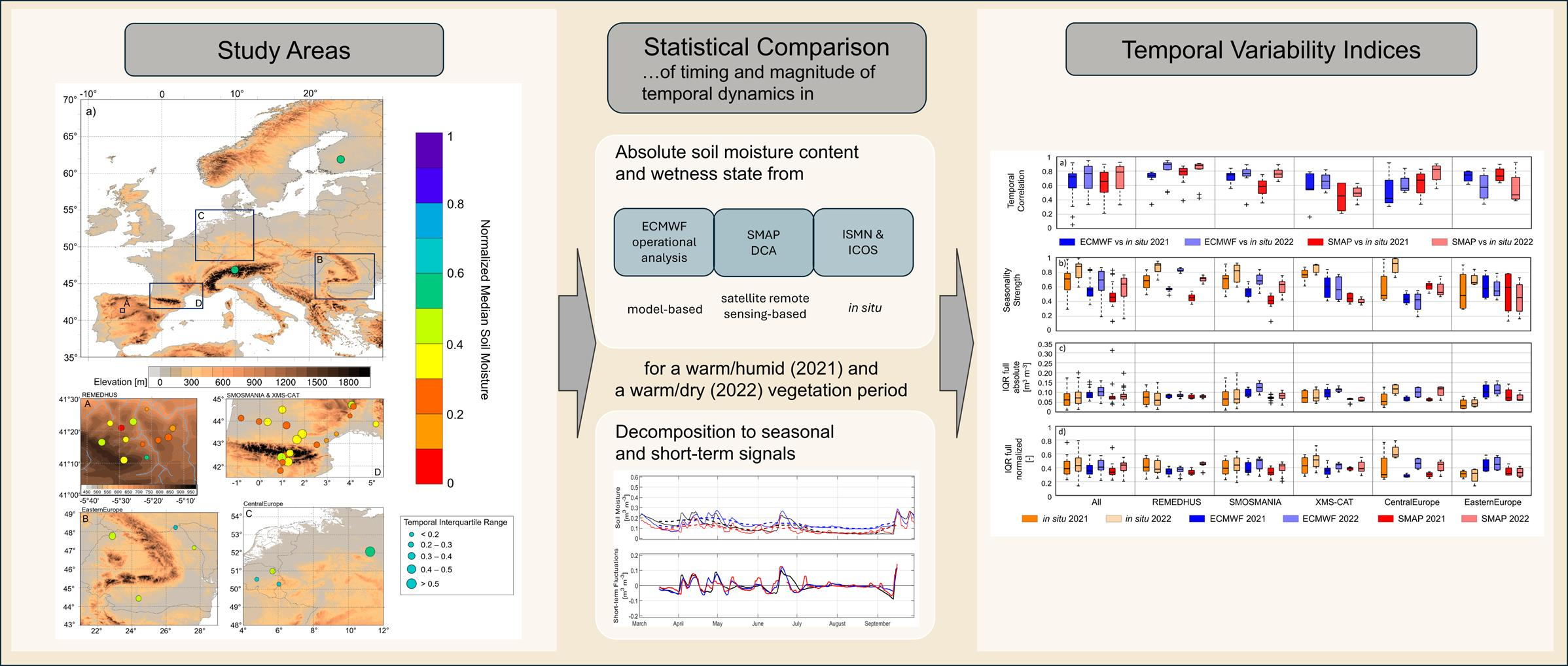 - This study found an overestimation of the magnitude of absolute soil moisture variability within both products at most stations due to an overestimation of short-term fluctuations.
