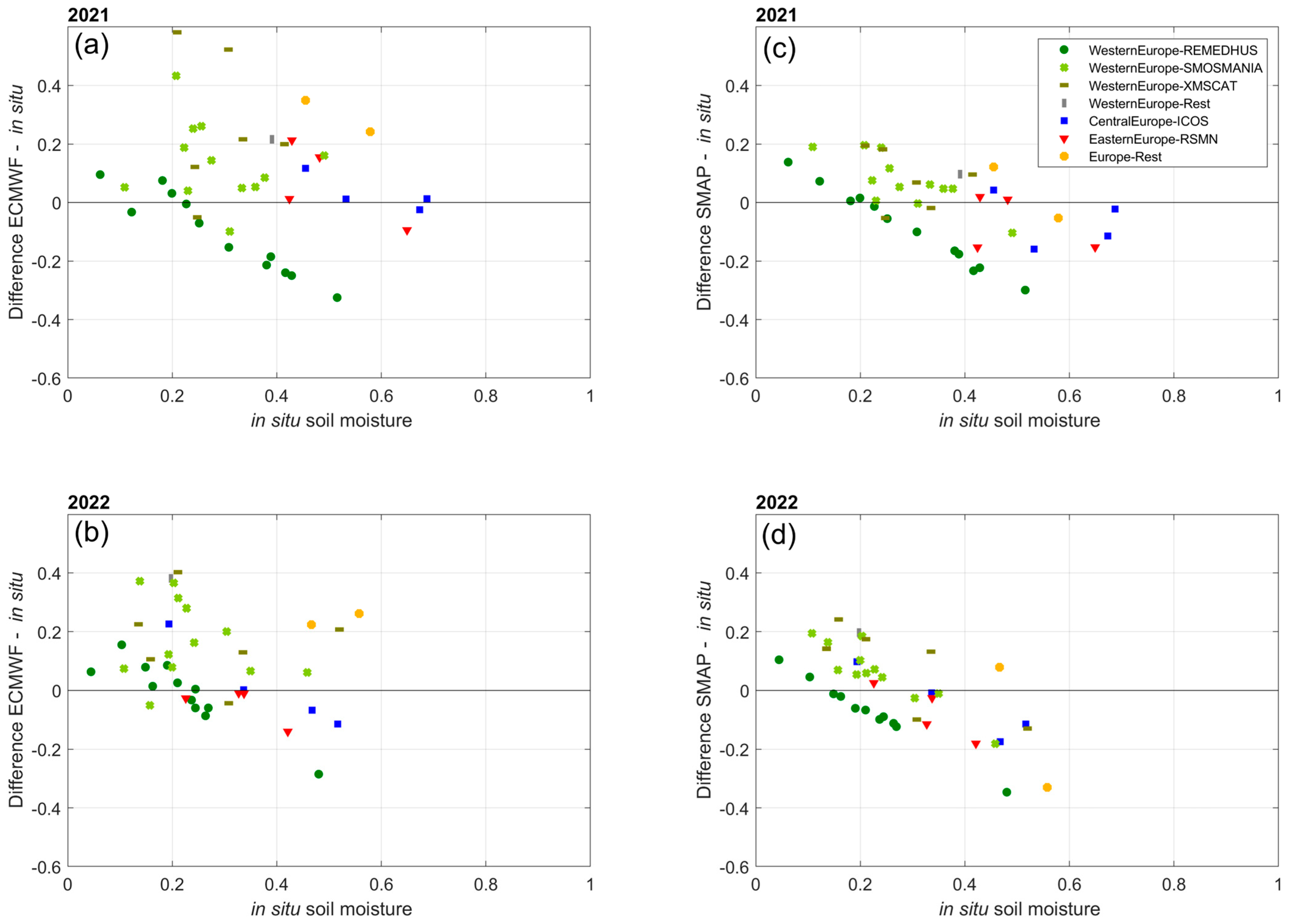 | Original temporal resolution | Up to ~12-hourly (morning and afternoon overfly); need 3-day running means to provide a gapless field | 6-hourly | Half-hourly (ICOS), hourly (ISMN) |