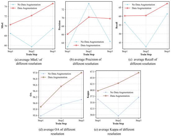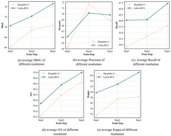 The purpose of designing this ablation experiment is to validate and investigate the effectiveness of the multi-resolution data augmentation method. In this ablation study, the sole controlled variable in this ablation study is whether or not to use our developed data augmentation method. In addition to MIoU, we also compute the Precision, Recall, OA, and Kappa to provide a more comprehensive assessment of the impact of our augmentation method. Table 4 presents the experimental results of the LaGu-RCL with or without our proposed data augmentation method. It can be observed that, employing our developed data augmentation method, most of the metrics can be improved. To comprehensively evaluate the effectiveness of the multi-resolution remote sensing data augmentation method, we also calculate the average metrics of LaGu-RCL across three resolution test sets at each learning stage, both with and without our augmentation method, as illustrated in Table 5. It can be observed that, when introducing our method, LaGu-RCL exhibits significant performance improvements, both in the average metrics across all resolutions at each learning stage and in the overall average performance metrics. To more intuitively investigate and validate the effectiveness of this data augmentation method, we also plot line charts of the average metrics across the three resolution test sets at each learning stage, as shown in Figure 8. The experimental results show that the line charts obtained after applying the data augmentation method are generally positioned higher, as shown in Figure 8a,c–e. This indicates that our developed method not only preserves the continual learning capability of LaGu-RCL but also maintains its semantic segmentation performance at a high level across all resolutions.