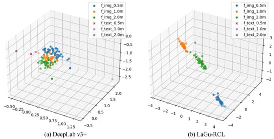 This ablation study aims to investigate and validate the effectiveness of employing language description. In LaGu-RCL, multi-resolution language descriptions are usually used in combination with the subsequent contrastive loss . When multi-resolution language descriptions are excluded, the contrastive loss becomes inapplicable. Given that the Seg model in LaGu-RCL adopts Deeplab V3+, LaGu-RCL without language descriptions and contrastive loss is equivalent to the original Deeplab V3+ [32]. Therefore, both LaGu-RCL and DeeplabV 3+ were trained following the three-phase curriculum (i.e., 2.0 m → 1.0 m → 0.5 m); each step uses training data from a single, distinct resolution, and no resolution data is revisited once the model proceeds to the next step. During the training of each phase, the segmentation model in DeeplabV3+ performed the same operations as that in LaGu-RCL. Consistent with the previous settings, after the end of each training step, the model weights achieving the highest MIoU on the validation set of the current stage are selected to evaluate semantic segmentation performance across test sets of all resolutions. The evaluation metrics include MIoU, Precision, Recall, OA, and Kappa. In addition, this ablation experiment also serves as the ablation experiment on contrastive loss. Therefore, to explore and verify the effectiveness of the contrastive loss proposed in this paper, this experiment further employs t-SNE to visualize the features and mapped to the Remote Sensing Heterogeneous Description (RSHD) space for both Deeplab V3+ and LaGu-RCL, allowing for an observation of their distribution after dimensionality reduction.