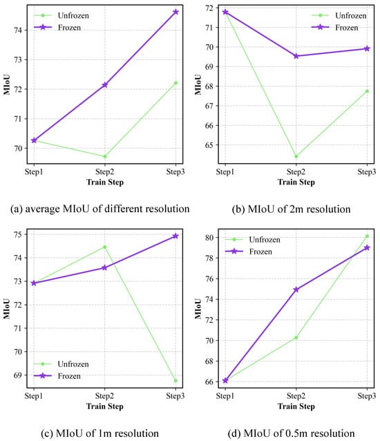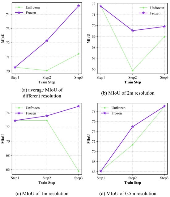 Ablation study regarding the decoder: The MIoU of LaGu-RCL on the MR-ExcavSeg dataset, under settings where the segmentation (i.e., seg) decoder is either frozen or unfrozen, across different learning stages and test sets of various resolutions, is reported in Table 10. The results show that, after unfreezing the decoder to allow its participation in training and parameter updates, the model achieves relatively better performance on the resolution corresponding to the current step. However, the performance at the other resolutions is consistently worse. To verify the overall effect, we compute the average semantic segmentation performance of LaGu-RCL over the three test-set resolutions for each learning stage with the Seg Decoder frozen or unfrozen. The resulting stage-wise average MIoU values are reported in Table 11. The results indicate that, although unfreezing the decoder allows LaGu-RCL to learn the data at the current resolution more effectively, both the average MIoU across all resolutions in Step 2 and Step 3 and the overall average MIoU decrease compared with the setting where the decoder is frozen. To more intuitively illustrate the continual learning effect of freezing the Seg Decoder, we plot the performance curves across learning stages, as shown in Figure 12. The results show that, compared with freezing the decoder, the performance curves obtained when the decoder parameters are unfrozen are generally higher at the resolution corresponding to the current step, but lower at the other resolutions. Moreover, except for the 2 m resolution, the MIoU under the frozen-decoder setting exhibits an upward trend, as shown in Figure 12a,c,d, indicating that freezing the decoder likewise leads to better continual learning performance for LaGu-RCL. Similarly, as illustrated in Figure 12b, the decline in MIoU at 2 m resolution is less steep when the decoder is frozen than when it is unfrozen. In addition, as shown in Figure 12c, for the 1 m resolution, the MIoU in Step 3 drops substantially relative to Step 2 when the decoder is unfrozen, suggesting that freezing the decoder can also effectively alleviate catastrophic forgetting in LaGu-RCL.