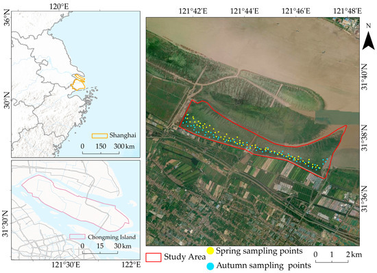 Chongming Island, located in the core area of the Yangtze River Estuary (121°09′–121°54′E, 31°27′–31°51′N), is the largest alluvial sandbar in China [25]. This study focuses on the Chongming Dongtan wetland (Figure 1). The geomorphology of this area is primarily formed by the long-term deposition of suspended sediments from the runoff [26]. It is characterized by wide and gentle tidal flats with a semi-diurnal tidal regime [27], making it a typical prograding tidal wetland. The region has a northern subtropical monsoon climate [28], with a mean annual temperature of approximately 15 °C and an average annual precipitation of about 1000 mm. The combination of abundant rainfall and warm temperatures creates favorable hydrothermal conditions that promote the development of wetland vegetation [29].