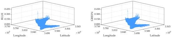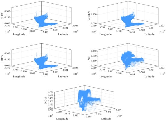 where ρ8 and ρ4 represent the reflectance of the B8 and B4 bands, respectively. To utilize both spatial and spectral information for vegetation distribution analysis, a three-dimensional feature space scatter plot was constructed (Figure 2 and Figure 3). In this plot, a pixel’s geographic coordinates (X, Y) define the planar axes, and a spectral index (reflectance or NDVI) forms the vertical Z-axis [35]. By fusing geographic and spectral dimensions [36], this approach helps distinguish tidal and micro-topographic influences on spectral signatures, providing an integrated spatial-spectral basis for threshold segmentation.