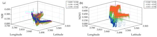 Three-dimensional scatter plots based on the optimal spectral indices for 2023: (a) Spring, using near-infrared reflectance; (b) Autumn, using NDVI.